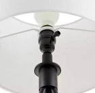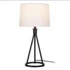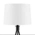 About This Product Brighten your space with the mid-century inspired Hampton Bay 23.75" Metal Tripod Higgins Table Lamp. This lamp features a sturdy metal tripod frame in modern black satin finish, with a matching black metal lamp neck for a seamless and elegant look. Topped with a 12" wide white linen drum shade, this lamp provides ample ambient lighting without harsh glare. Uses one standard A19 E26 light bulb, max 9-watt LED or 60-watt incandescent (light bulb not included). A black 60" power cord completes the lamp's contemporary look. Modern metal table and desk lamp features circular tripod base for an airy look that provides excellent balance, in black satin finish Classic white linen drum shade is slightly tapered outward to provide ample lighting without harsh glare Assembled Dimensions: 12" W x 23.7" H; space-saving lamp base measures 7.8" Dia. Shade Dimensions: 11" wide at the top, 12" wide at the bottom, 8.5" tall Features a 2-way rotary switch located on base of bulb socket; 60" matching black power cord; ETL certified for safety Uses one standard A19 E26 light bulb, max 9-watt LED or 60-watt incandescent equivalent (light bulb is not included) Pair with coordinating Hampton Bay Higgins Floor Lamp (sold separately)