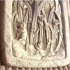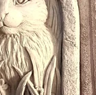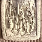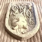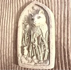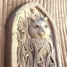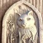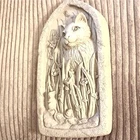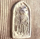 This cute indoor/outdoor stone plaque showcases a stylized cat in a serene pose, surrounded by delicate plant motifs, a butterfly, snail, and a tiny mouse friend. Crafted with attention to detail, it adds a touch of charm to any room. Perfect for cat lovers. 9 x 5.25 x 1.25 inches 2.5 lbs Used in excellent condition