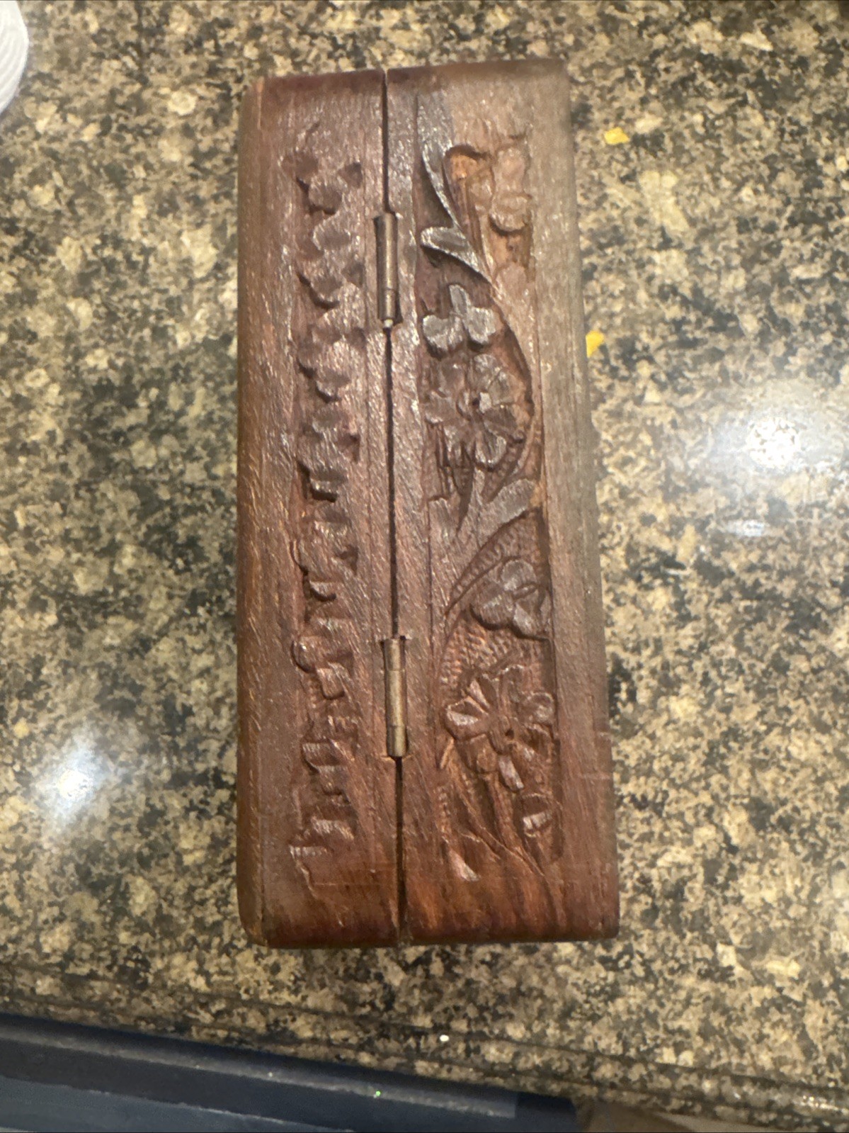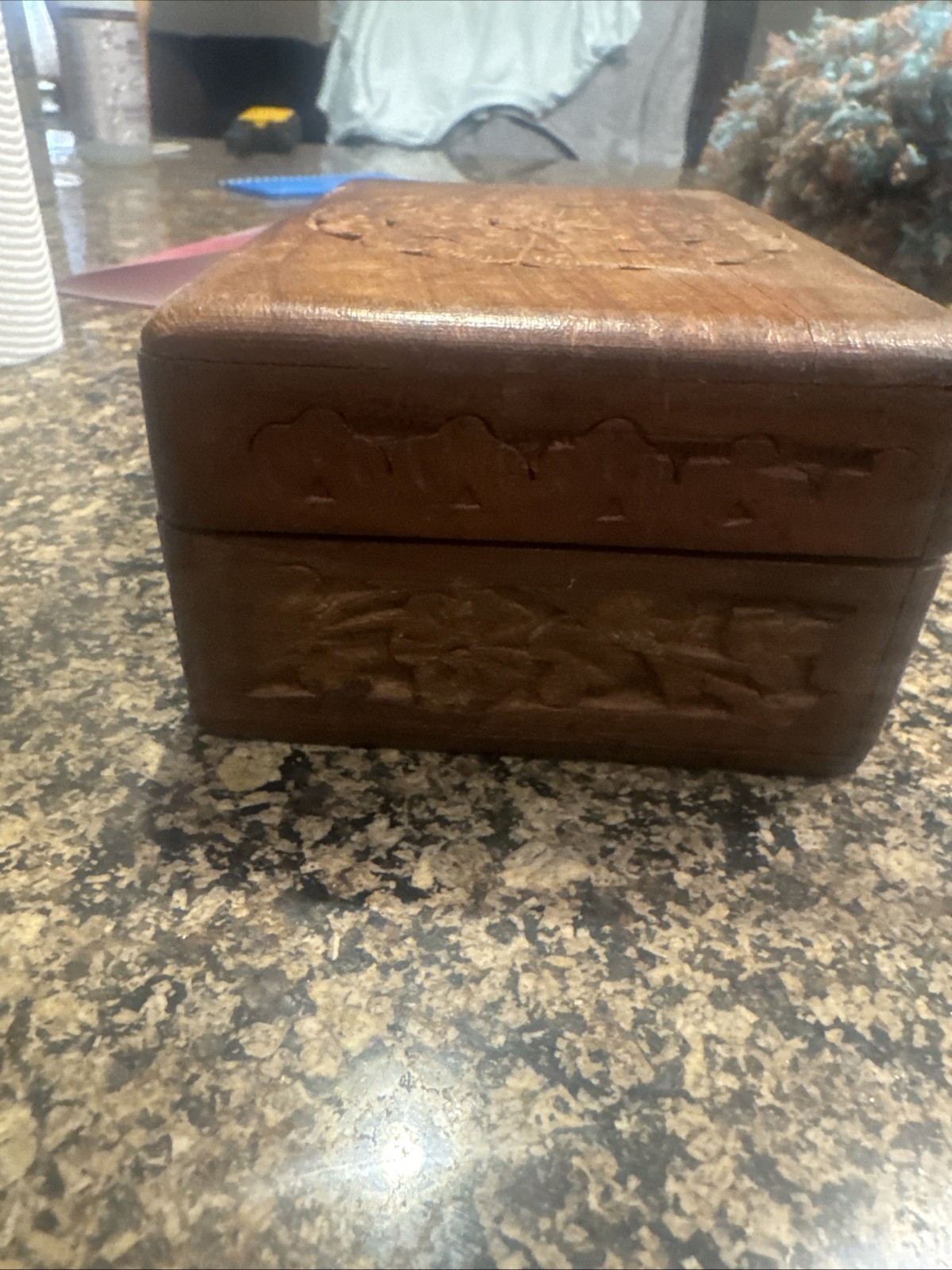 Hand Carved Wood Box Marked India Trinket Jewelry. Condition is Used. Shipped with USPS Ground Advantage.