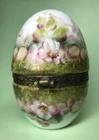 FROM MADEIRA WITH LOVE.... Found in an estate liquidation on the island of Madeira in Portugal, that of a family with ties to France. Purchased a decade ago at the Flea Market in Paris, a hand painted trinket box in the form of an egg. It stands 3 inches tall and was signed by the artist and dated 2006. Additionally marked "Peinte a`la Main" for hand painted. The artist name is i mpossible to decipher. It has survived in good condition, free of chips or cracks, no abrasions. I did notice a small drop of hardened glue on the inside of the lower half that I have left as found. I have inserted a standard size playing card in one photo as a reference for size. MUCH OBLIGED