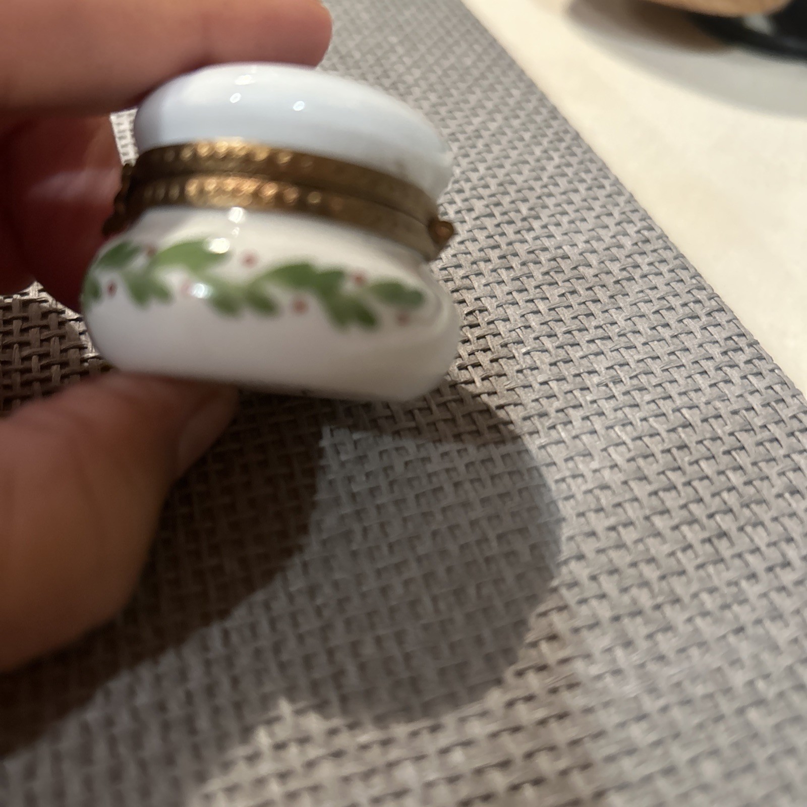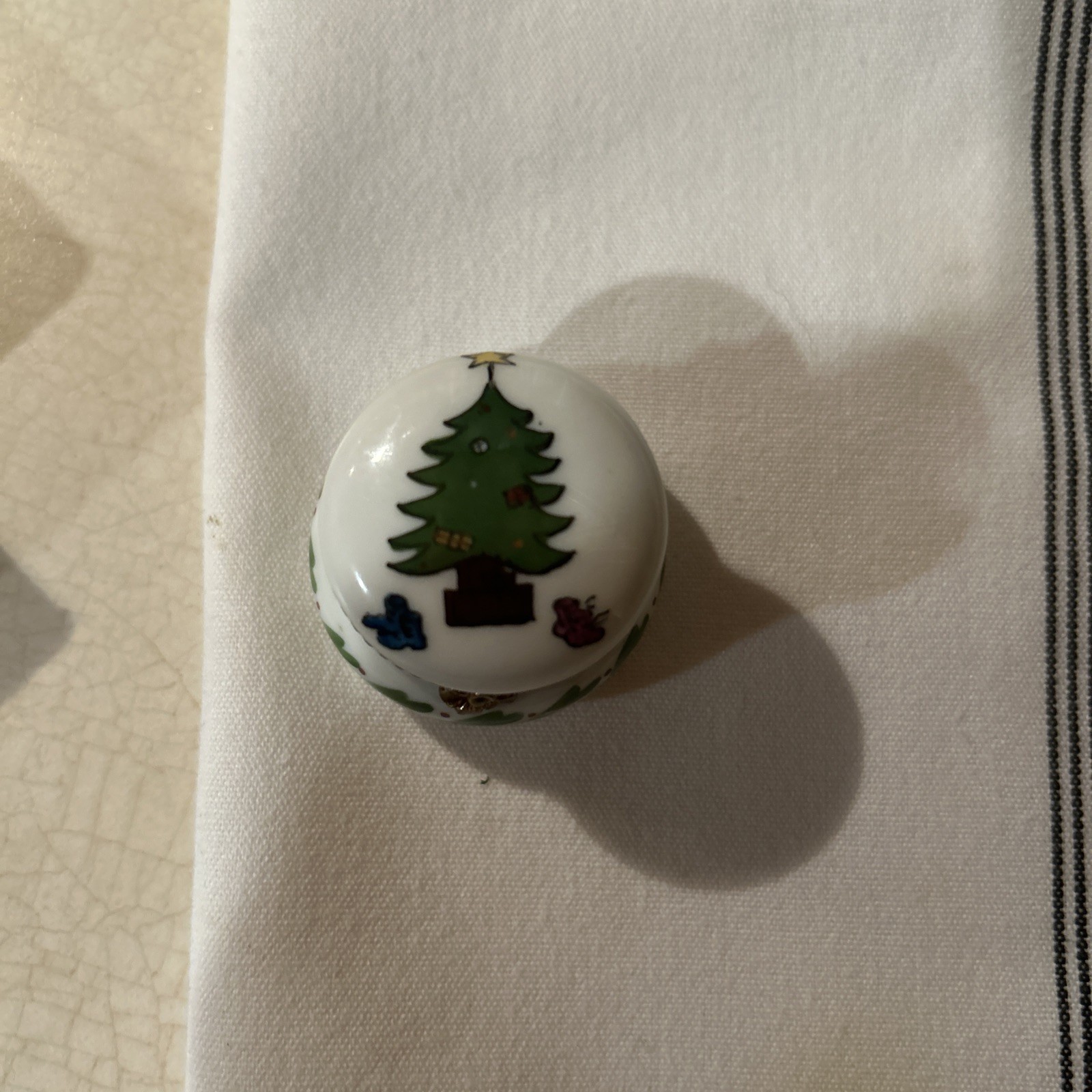This Christmas Limoges Peint Main Trinket Box is a small, multicolor porcelain treasure chest handcrafted in France. Featuring a festive seasonal design and a French style, this original trinket box is perfect for storing small keepsakes during the holiday season. The Limoges brand ensures high quality and craftsmanship, while the snap closure adds a secure touch to protect your precious items. Clean with a damp cloth to maintain its original beauty and enjoy this unique piece in any room of your home . Perfect like new condition