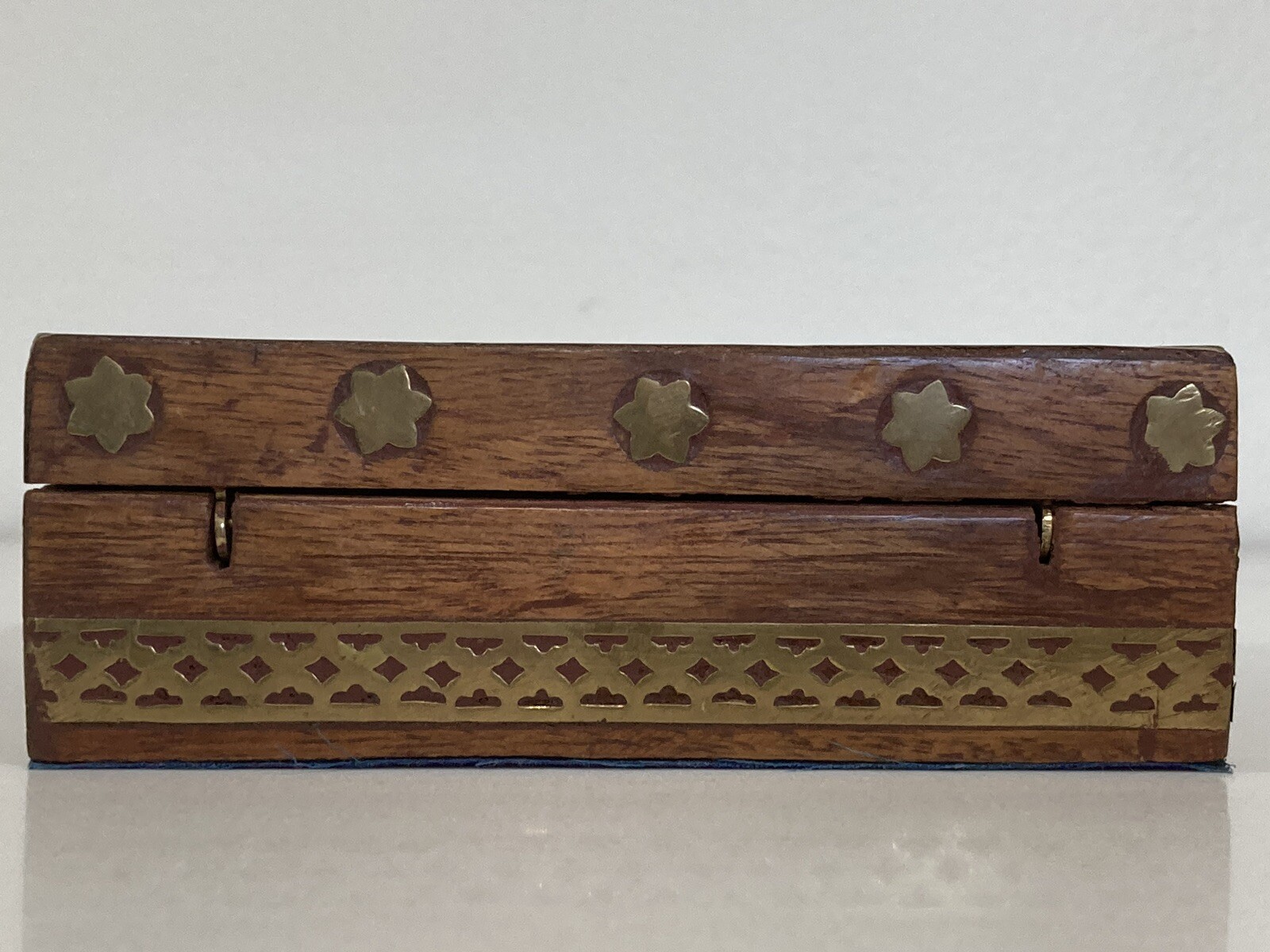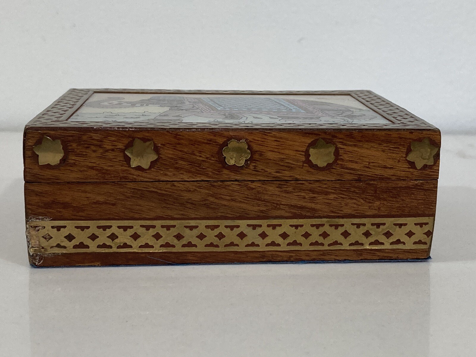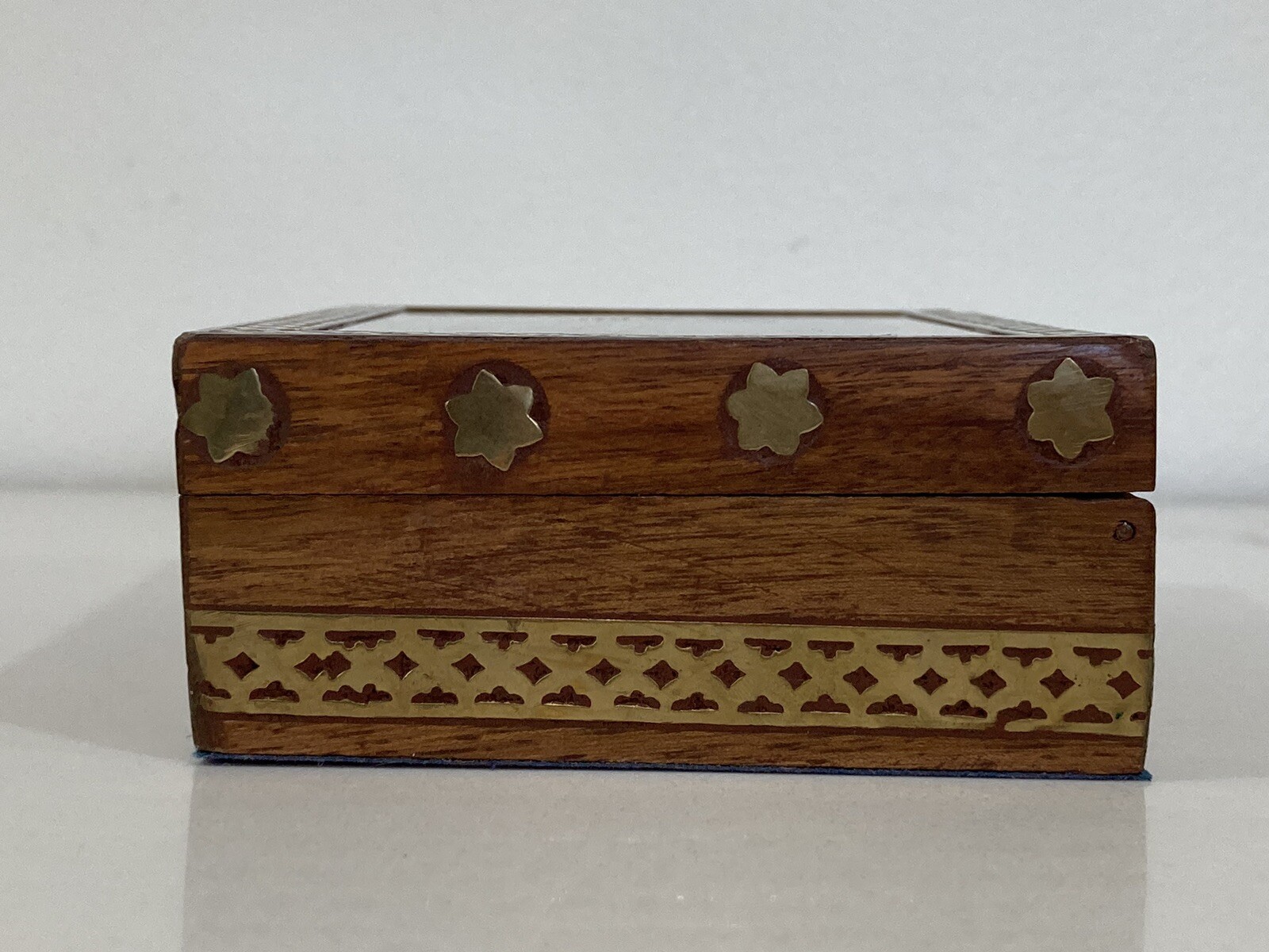 This handmade wooden jewelry box from India features a beautiful glass painting of an elephant surrounded by a brass border. The box measures 4.25"x3.5" and is perfect for storing your gemstone jewelry. The velvet-lined interior provides extra protection for your precious items. Crafted from high-quality wood and glass materials, this jewelry box is not only functional but also a beautiful decorative piece. The rectangular shape and blue color make it a unique addition to any jewelry collection. With its intricate details and charming elephant theme, this jewelry box is sure to impress.