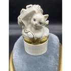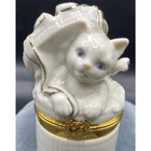 The Handcrafted First Issue Lenox Treasures The Cat's Surprise Box is a small, round trinket box made of porcelain in cream and gold colors. Featuring a cat subject with carvings, this hand-painted box has a glossy finish and a 3D effect. Perfect for any room, this original collectible from the Lenox brand is suitable for furniture and adds a touch of elegance to any space. With a high gloss texture and a boxed packaging, this unique item is a charming addition to any décor collection. This elegant first issue Lenox trinket box is in excellent pre-owned condition. It has no cracks and no chips. Please refer to pictures for more information. Trinket box only. Measurements: Height 3.25 in Length 1.75 in