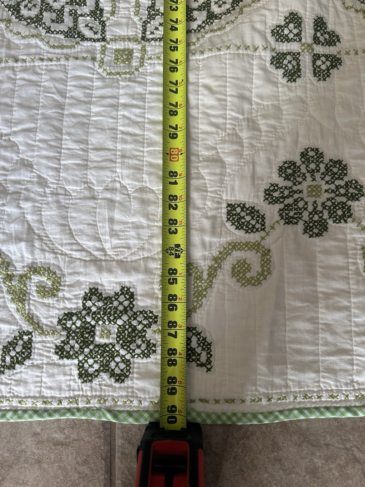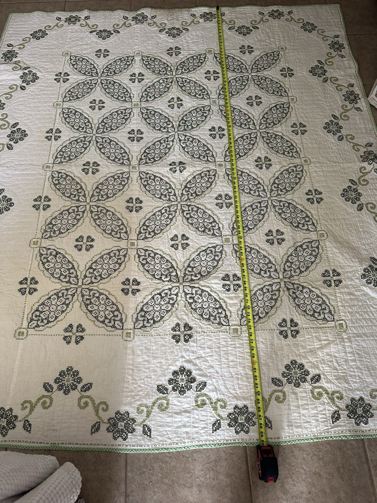 This hand-embroidered quilt features intricate floral motifs on a quilted white fabric, making it a beautiful and unique addition to any room. The king-sized quilt is made of cotton and is ideal for all seasons, providing both warmth and style. The vintage design and handmade craftsmanship add a touch of authenticity and charm to this original piece, which is perfect for a collector or someone looking to add a special touch to their home decor. Shown in pics just a couple of small stains that will come out. But otherwise beautiful piece and great condition no refunds