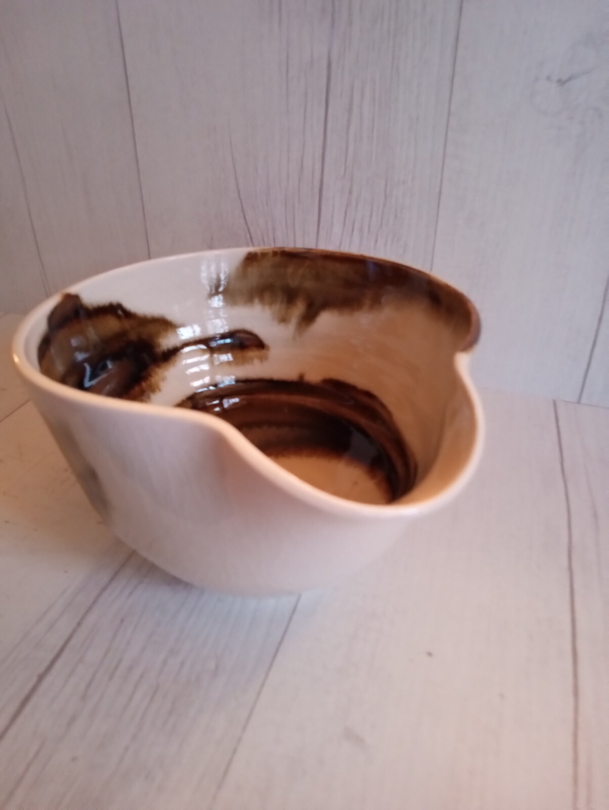 This is a handmade footed pottery item could be a creamer could be a bowl ... You decide white & brown tone swirl effect with a glossy finish. Handle on one side.