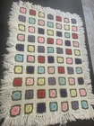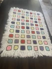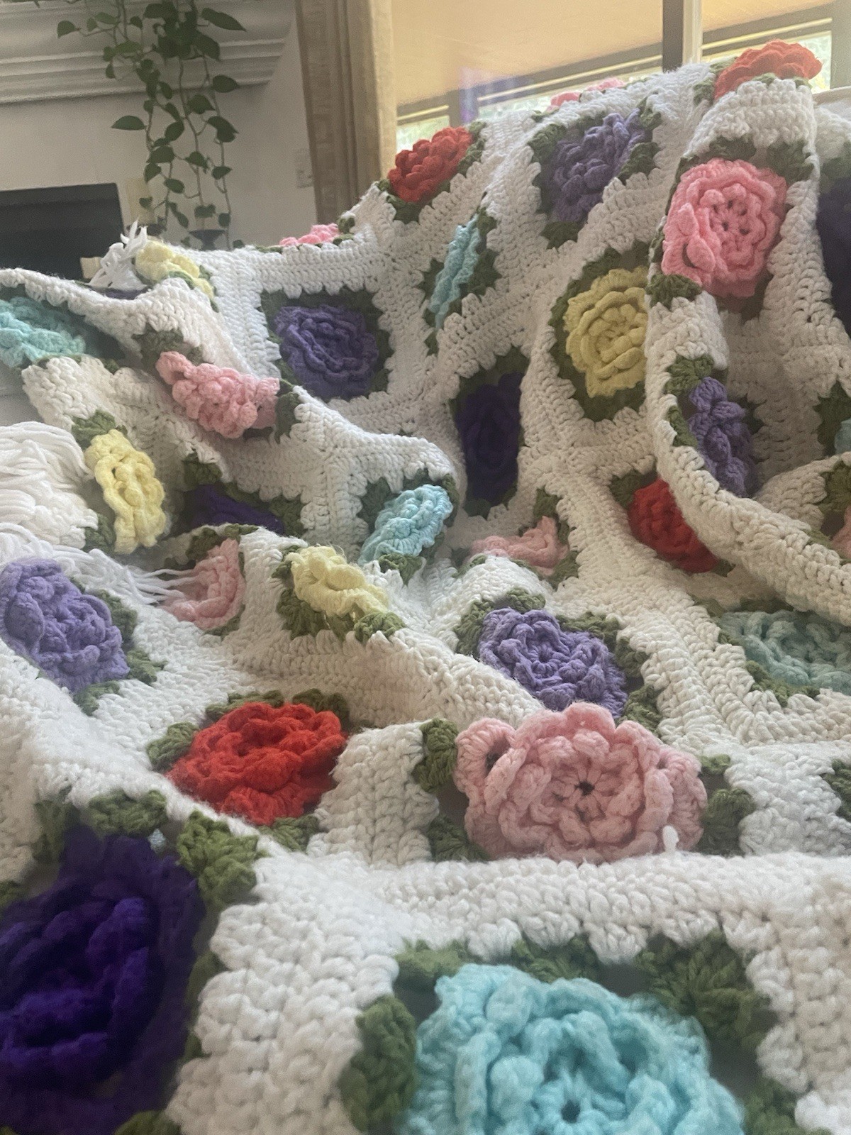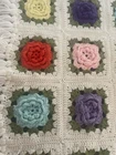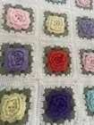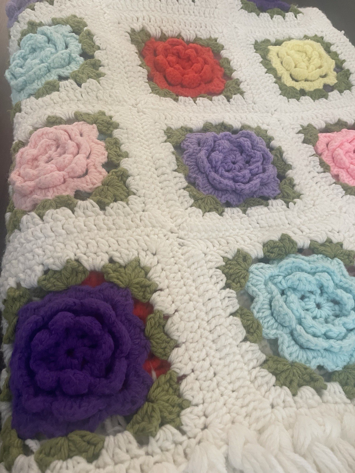 Vintage Handmade Crochet Rose Afghan Blanket - Large Raised 3D Floral Granny Throw Blanket 84” x 60” Beautiful vintage hand-crocheted afghan blanket featuring dimensional raised crochet roses in soft pastel and jewel tones including pink, lavender, aqua, yellow, and red. Each square is individually crocheted and joined to form a classic granny square floral pattern. The roses are raised and sculptural, giving the blanket gorgeous texture and a truly special handmade heirloom look. The creamy ivory background highlights the colorful flowers, while a full fringe border frames the piece beautifully. Large and cozy, this blanket is perfect for draping across a sofa, reading chair, or bed. It would also make a beautiful cottagecore, English garden, or grandmillennial decor accent. This piece clearly reflects many hours of careful handmade craftsmanship. Perfect condition #vintage #crochet #afghan #throwblanket #handmade