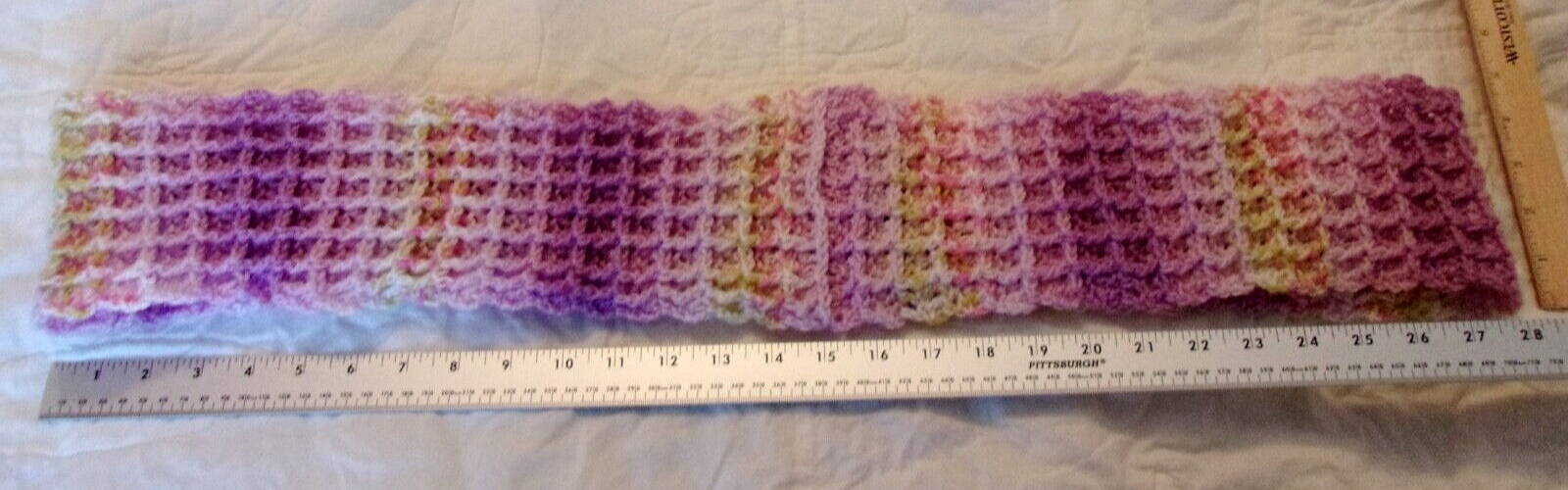 This snuggly scarf is approximately 56" long and 5" wide. It's brand new and features an intricate waffle stitch. The reverse side makes a very interesting texture that's soft and warm, so it looks fine with either side showing. The scarf is joined into a 56" long infinity loop. It's plenty long enough to be worn as a cowl, or even as a hooded cowl! It's handmade of brand new Lion Brand yarn that was made in the USA. I can't remember the name of the color. It's a muted Unforgettable yarn, ranging from a light purple, through shades of sage green to light yellow. This is a very calming and mellow scarf, perfect for a stormy day! I crochet in a smoke free, pet freehome. RETURNS: I stopped accepting automatic returns because of the expense of "buyer's remorse". If there is a mistake in a listing, I will ALWAYS do my best to make it right, if you will contact me immediately! Please visit other listings and see upcoming auctions. I try to list different items on a regular basis. NOTE: I list for family and friends. All items are from smoke free homes. The pre-owned items that I list are used, vintage or just plain old. Items are researched on various sites, to get pricing ideas, and I'll always present reasonable offers to owners of the listings. Items are cleaned, unless the descriptions explain why that isn't possible or wise. Items may show some form of wear, scratches, or other age related imperfections. Items are described as accurately as possible, and I try to get great photos. Please avoid misunderstanding by reading ALL text, and seeing ALL pictures. If you need more information: please ask any questions before bidding/buying. Shipping: I use eBay's calculated shipping, labels, and tracking services. The calculator estimates shipping based on the total weight and size of the package, to your zip code. Please ask for an invoice when buying multiple items, and I'll combine shipping to save your money! Please remember that I must still pay for "free shipping" to you. Sellers have NO control over the cost of shipping . Fees cost sellers OVER 20% of the TOTAL of what you pay . PLEASE keep this in mind when making an offer, and when leaving feedback about what makes up "very fair and reasonable shipping charges". I work hard to earn your 5 star rating! This is a "yard sale" (NOT a professional seller), so I re-use CLEAN shipping materials to help keep costs low. I ship via the Postal Service, asap after payment is received! Please note that eBay cancels unpaid orders on the 4th day. If you’d like to know about new listings, please "follow" and see new listings in your feed. Thanks for looking! Bid/buy with confidence - see my feedback.
