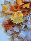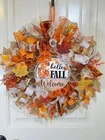 About 22 inches, 5 inch-deep. Burlap w/ fall colored tinsel, orange, and white mesh back door or mantle wreath. Fall themed w/ vibrant multi color wired ribbons (9 styles). A “Hello Fall Welcome” Wooden Acorn & Leaves Sign + faux leaves, acorns and spray adorn this festive wreath. This wreath is built on a 14 frame. Perfect for decorating your home for Fall/ Autumn/Thanksgiving. Fitted with 20 LED lights to illuminate at night. Wreath made in a smoke free environment. Wreath can be displayed either indoors or outside. However, for optimal durability please avoid direct sunlight and harsh elements. Ships in a sturdy box that will be closer to frame size in order to stay below the shipping dimension restrictions. On arrival you may need to fluff ribbons and bows so it will be ready to beautify your door or mantle. Please be aware, deco mesh has a tendency to fray at the edges. Simply trim any loose strands to preserve the beauty of the wreath. W12Tg13D212179COP