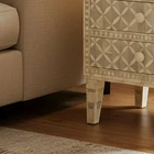 Modern Geometry Meets Artisan Craft This elegant Cream Bone Inlay Cabinet with three drawers features a refined geometric pattern that blends traditional craftsmanship with modern design. Each motif is hand-inlaid using ethically sourced camel bone set against a soft off-white resin base—creating a subtle, dimensional texture perfect for neutral, luxe, or minimalist interiors. Designed and handcrafted by artisans in Rajasthan, India, this piece is both decorative and functional. The three drawers offer practical storage for living rooms, bedrooms, or entryways—ideal for stowing essentials without sacrificing style. Its clean silhouette, delicate tones, and handcrafted appeal make this cabinet a versatile accent piece for any room in your home.