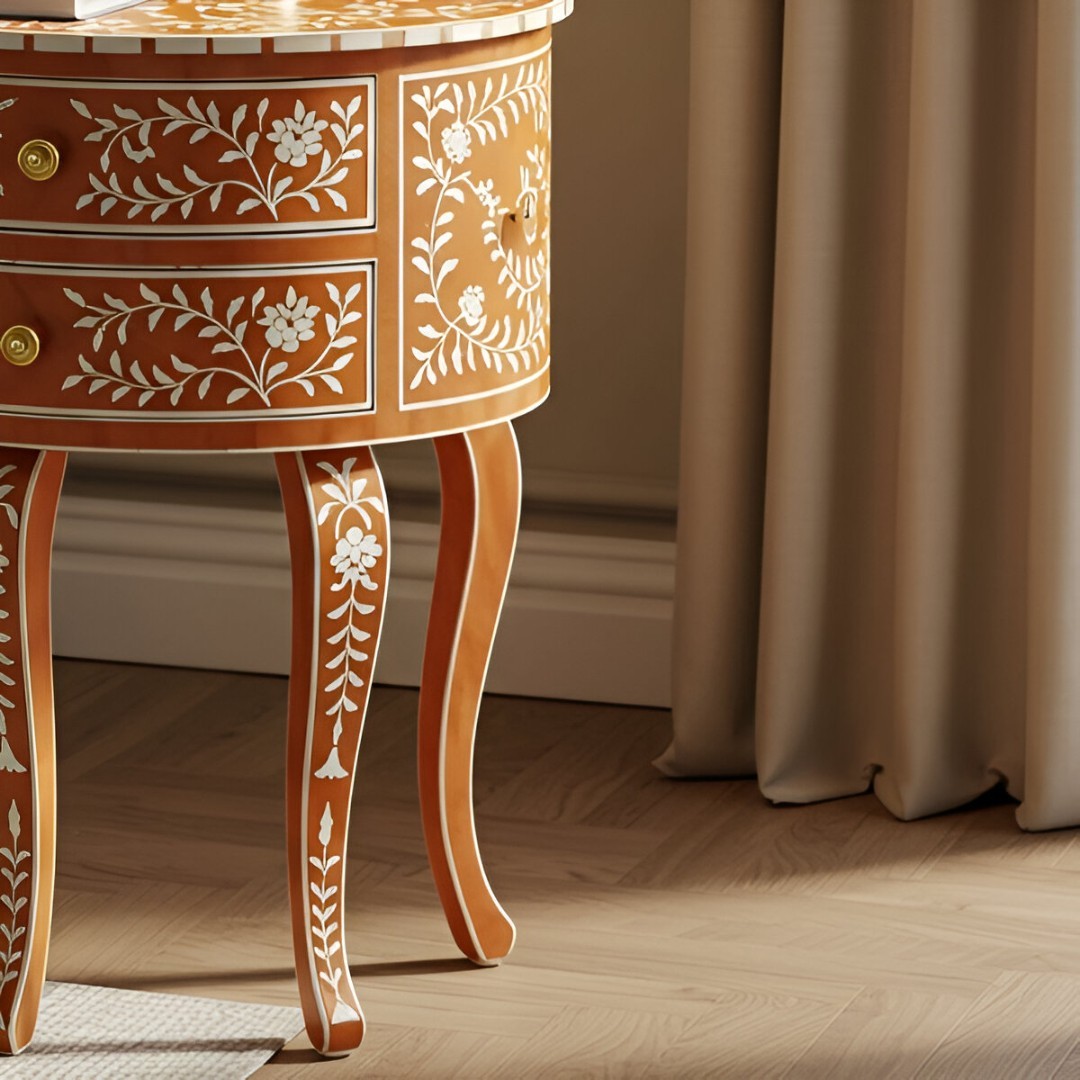 This gorgeous bone inlay end table is a showstopper! The vibrant orange floral design pops beautifully against the ivory inlay, adding a luxurious touch to my living room. I love the curved legs and compact size—it fits perfectly next to my sofa without crowding the space. The two drawers are surprisingly roomy, great for storing remotes or small decor. The craftsmanship is impeccable, with every detail carefully handcrafted. It feels sturdy yet elegant, like a true heirloom piece. Definitely worth the investment for anyone wanting to elevate their home with artisanal charm!