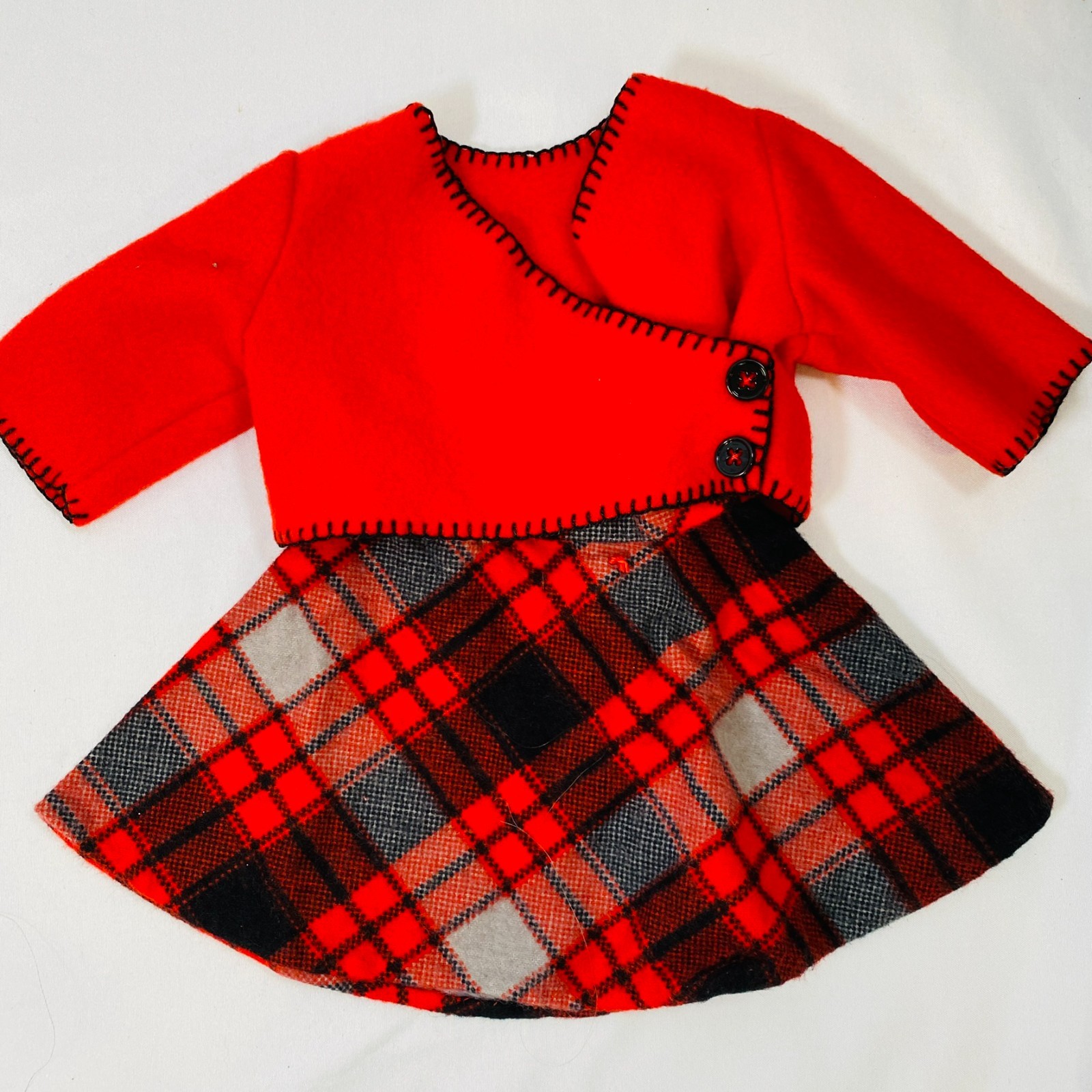 Handmade Set for 18" American Girl Dolls & Similar. Includes Red Fleece Sweater & Red Plaid Flannel Skirt + Floral Print Dress w/ Attached Tulle Crinoline. In excellent condition, no flaws to note. Very nicely made. Please see all pictures for exact cosmetic condition and other details, and ask any questions before purchasing. We are a husband and wife team with a growing family, and greatly appreciate your support of our small business. Please browse our eBay store for a variety of other American Girl items. We hope you enjoy this set!