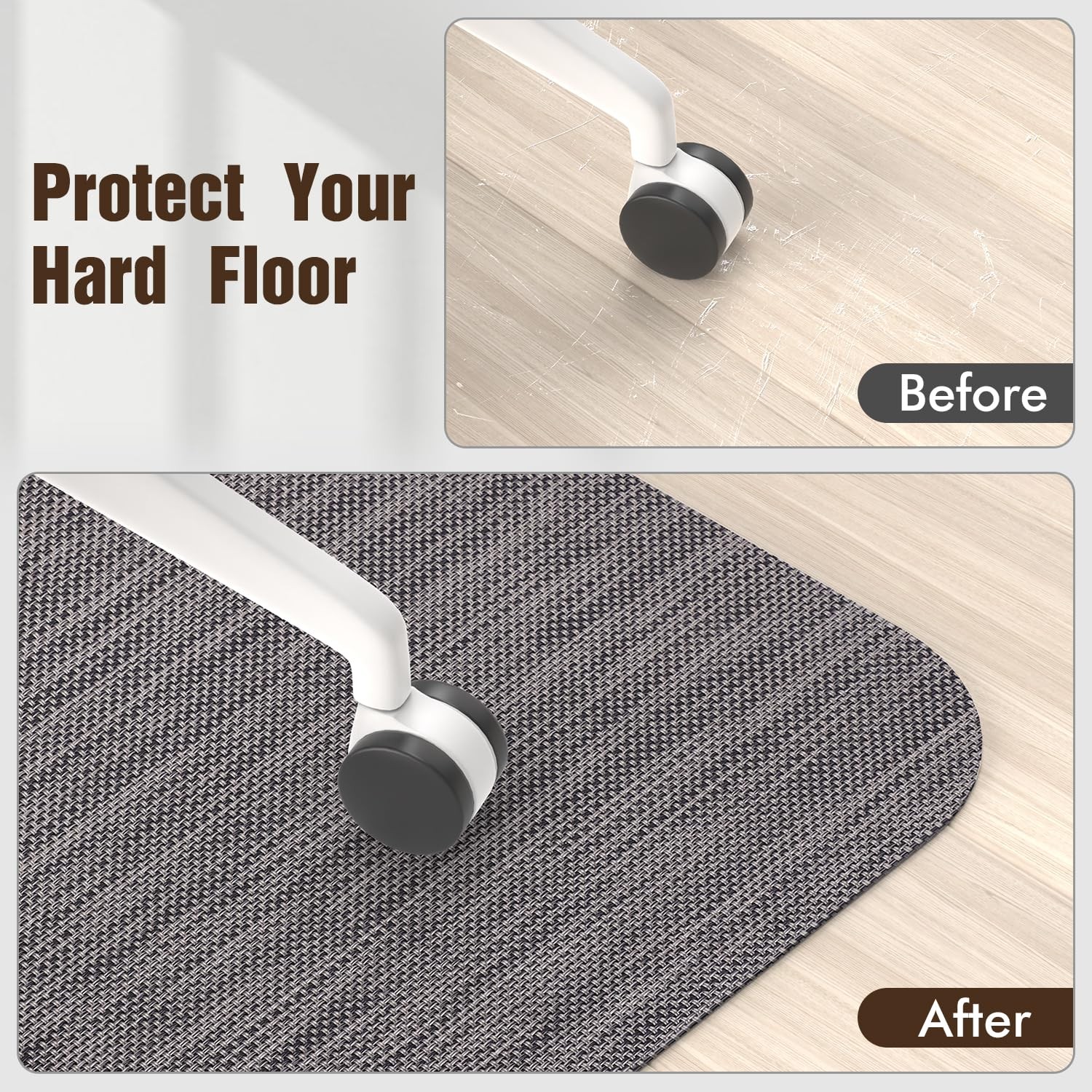 Office Chair Mat for Hard Wood Floor Specialized Designed: The office mat is designed with a unique rattan-like woven pattern. It is easy to lay flat. This specially designed mat could be matched your surroundings. Perfect for a variety of environments including offices, computer rooms, gaming rooms, bedrooms, and study spaces. Easy to Clean: The floor chair mat is waterproof, oil-resistant, and heat-resistant, which is easy to clean and maintain. You can just wipe it gently with a cloth to clean it as new. The mat can also provide you with the best hard floor protection. Safe & Flame Retardant: Our desk chair mat is made of high-quality PVC which is harmless and safe for daily use. Plus, it's flame-retardant, so you don't need to worry if the cigarette drops on the mat. Non-slip Design: The bottom of the chair mat is covered with a layer of rubber that does not contain industrial glue, which is safe and non-toxic. And this greatly increases the friction between the chair mat and the floor which means the chair mat will not move easily. Multi-purpose Hard Floor Mats: It could be used as office chair mat, wood floor protector mat, computer mat, table mat and children pet mat. It is suitable for hard floors including vinyl, stone, tile, wood, laminate and concrete. NOT RECOMMENDED FOR CARPET.