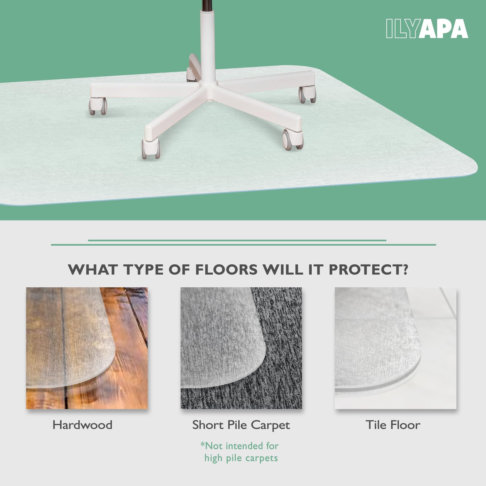 Office Chair Mat for Hardwood Floors 36 x 48 - Floor Mats for Desk Chairs Office Chair Mat for Hardwood Floors 36 x 48 - Floor Mats for Desk Chairs Office Chair Mat for Hardwood Floors 36 x 48 - Floor Mats for Desk Chairs Tough Durable Design Our office floor mats can withstand any office chair. They're slip and scuff resistant and easy to clean if they ever get spilled on. That way they'll stay looking new and neat and your wood, tile, laminate or other hard flooring will remain 100% protected. Plus, these mats can also be used as a desk mat to protect the top of your desk. Long-Lasting Hard Floor Protection Our floor mats for office chairs are built to last. They come with an automatic one year warranty, and you can register online for a Free Lifetime Warranty. 48 x 36 Inches. 1/16 inch (1.5 mm) thick. Makes great Christmas gifts. We know you'll love the Ilyapa Office Floor Mat. Free shipping when you click "Add to Cart" and order today! "desk chair mat for carpet chair mats for carpeted floors floor mat for office chair plastic floor mat for office chair carpet chair mat for office chairs office floor mats for carpet chair mats for carpet plastic floor mat for office chair clear chair mat computer chair mat for carpet desk chair mats desk floor mat for carpet floor mats for office office chair mats for carpeted floor desk chair mat chair mat office office chair mat for carpet computer desk chair mat computer chair floor mat plastic floor mats" Product Specifications PROTECT YOUR HARD FLOORING from scratches and marks of any kind. Perfect office floor mat for hardwood, tile, laminate, concrete, and vinyl floors. SLIP & SCUFF RESISTANT - Our chair mats feature mooth backing for use on hard floors. The upward surface is lightly textured for controlled chair movement. Not for use on carpeted floors. EASY TO CLEAN - If there are ever any spills, simply wipe your office plastic mat down with a soapy dishcloth. TOUGH DURABLE DESIGN - Made of durable PVC, our office chair mats are built to last. No cracks, curls or discoloration BUY WITH CONFIDENCE - Ilyapa stands behind all of its floor mats for office chairs 100%. The Office Floor Mat comes with an automatic 1 year warranty. Register online for a FREE LIFETIME WARRANTY