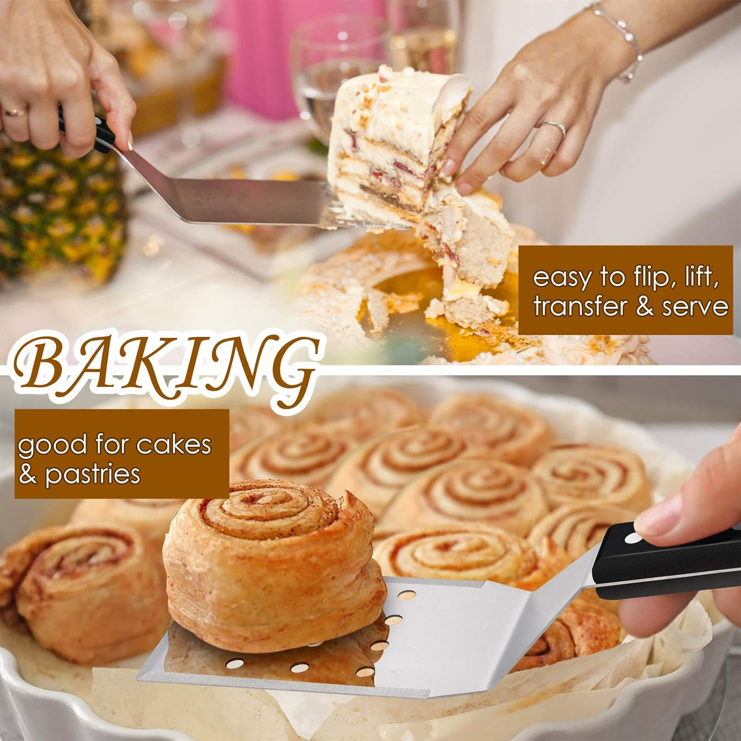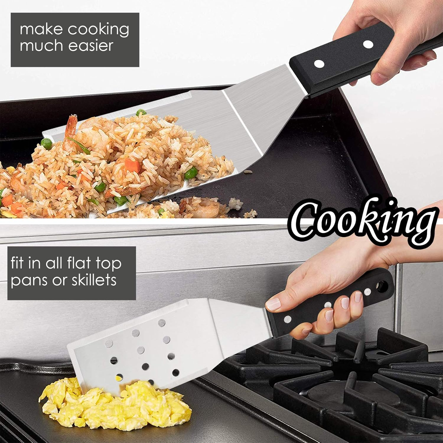 Store New Arrivals Add to Favorite View Feedback Contact Hasteel Metal Spatulas, Stainless Steel Griddle Spatula Tools with Riveted Handle, Heavy Duty Burger Turner for Teppanyaki BBQ Flat Top Hibachi Cast Iron Grilling Cooking, Dishwasher Safe - (2Packs) Description Color Abs Handle Product Dimensions 11.5"L x 3"W Material Stainless Steel Country of Origin China Item Weight 15.5 ounces Handle Material Metal,Plastic,Stainless Steel Is Discontinued By Manufacturer Yes Brand HaSteeL Blade Material Stainless Steel GRIDDLE SET - Including a solid metal spatula and a perforated burger turner to meet different cooking needs, Size 11.5in and blade width 3in, Plus 2 hooks for convenient hanging and storage without mess, Dishwasher safe DURABLE & STURDY - Made of high quality stainless steel ensure a long service life, Up to 1.5mm thickness of heavy duty metal hold heavier stuff without bending, Matte finished and smooth metal for easy and safe cleaning RIVETED HANDLE - ABS plastic handle with triple rivets is more stable than those flimsy ones, Ergonomic handle fits perfectly into extended metal part and ensure a better use, Non falling nails and wobbling handles BEVELED EDGE - Advantage of 3-sided beveled edges make flipping, frying, transferring and lifting effortless, Sharp enough for great cutting and scraping, Perforated surface can filter extra grease or liquid A MUST HAVE - Multipurpose for indoor and outdoor, Like kitchen cooking and baking for homemakers, restaurant serving and preparing for chefs, backyard party, cookouts, camping, tailgating for BBQ fans HaSteel Metal Griddle Spatula Set of 2 is made of premium stainless steel with solid handle to make you feel like a grill pro. Built to last by 1.5mm thickness of heavy duty metal to ensure bending proof. Ergonomic ABS handles are heat proof to protect your hands from scalding and ensure a comfortable grip. 45° angled structure and beveled edge make cooking, flipping and frying much easier and reduce fatigue while use. Specifications: Content: 1 x Solid Metal Spatula, Size L 11.5in by W 3in 1 x Perforated Burger Turner, Size L 11.5in by W 3in 2 x Hanging Hooks Blade Material: High Quality stainless Steel Handle Material: Heatproof ABS Plastic Using tips: 1. Use warm soap water to wash thoroughly those residue left from manufacturing before first use. 2. Used mild detergent to clean up after each use, then dry it by soft rag immediately instead of air dry to avoid water stains. 3. Store it in a dry place to keep its beautiful surface and durability. Satisfaction guarantee: HaSteeL attach great importance to every customer’s complete satisfaction and shopping experience. Your support and trust in us are just what we are strive for. We’re always here to solve problem for you at the first time. ABOUT US We offer the best prices around on high quality products. Our E-store includes media such as books, movies, music and games while offering electronics, toys, sporting apparel, clothing, tools, general home, garden items and more. SHIPPING We are always working hard to ensure your package arrives as soon as possible. Please understand that some factors like weather, high postal traffic, and the performance of shipping companies are outside of our control. We offer free shipping to the lower 48 states and ship within 2 business days of payment, usually sooner. We do not accept P.O. Boxes. Please provide a physical address. RETURNS We offer a 30-Day Return Policy on items which you are not completely satisfied with. You have the option for a full-refund or an exchange of the item. No returns are available on items shipped outside of the USA. PAYMENT We accept PayPal. CONTACT US This page content is yet to come Please ad us to your favorite seller and visit again later Thank You CUSTOMER SATISFACTION We try our very best to make sure every customer is completely satisfied. If there's a problem, message us! We're happy to help.