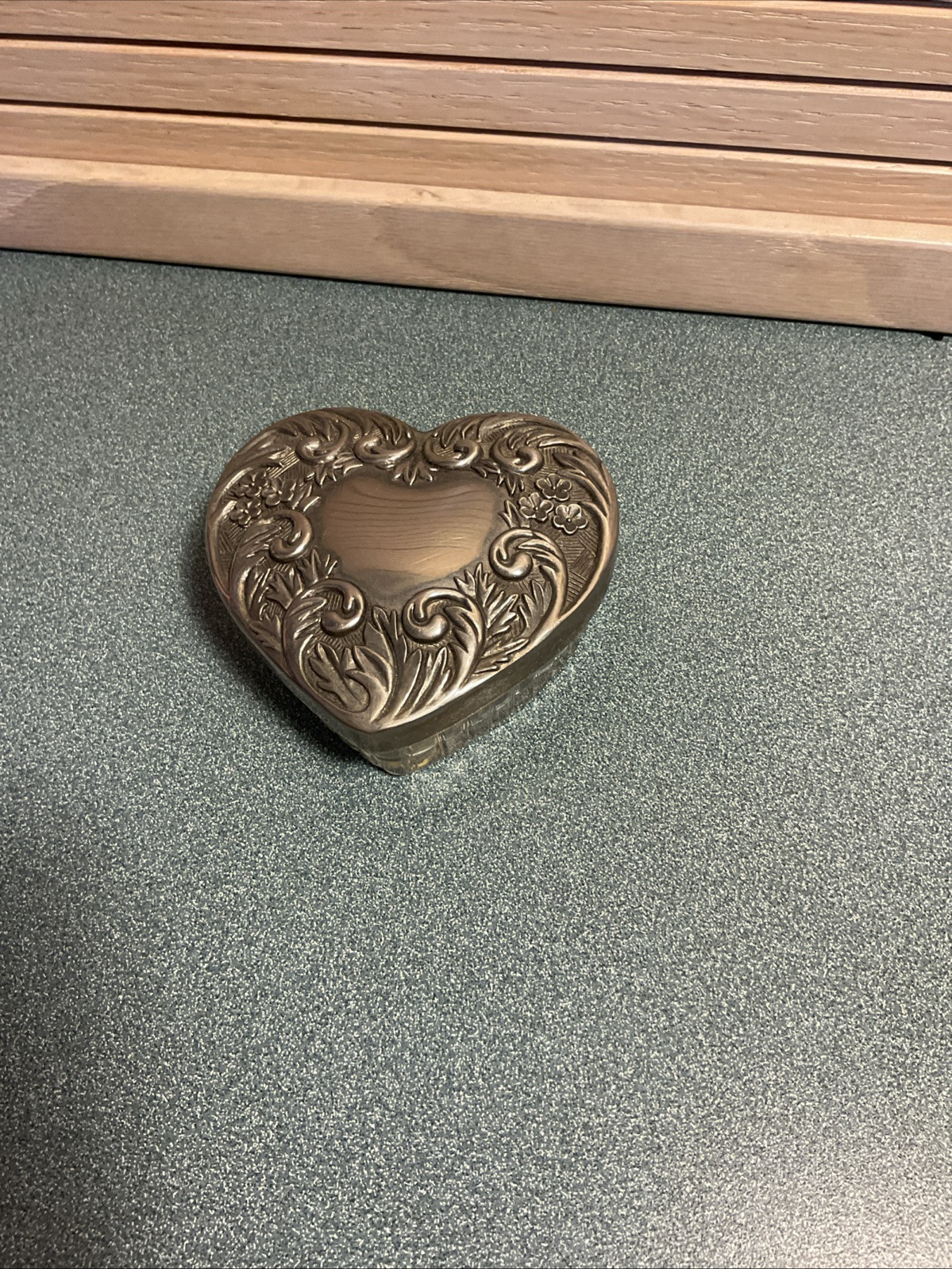 The product is a heart-shaped glass bowl with a silver lid. It measures 4 inches in length, 5 inches in width, and 1.5 inches in height. The bowl is unmarked and requires hand washing. It is a decorative piece of cookware/dinnerware that includes a bowl and lid. The design is elegant and would make a lovely addition to any dining or display setting.
