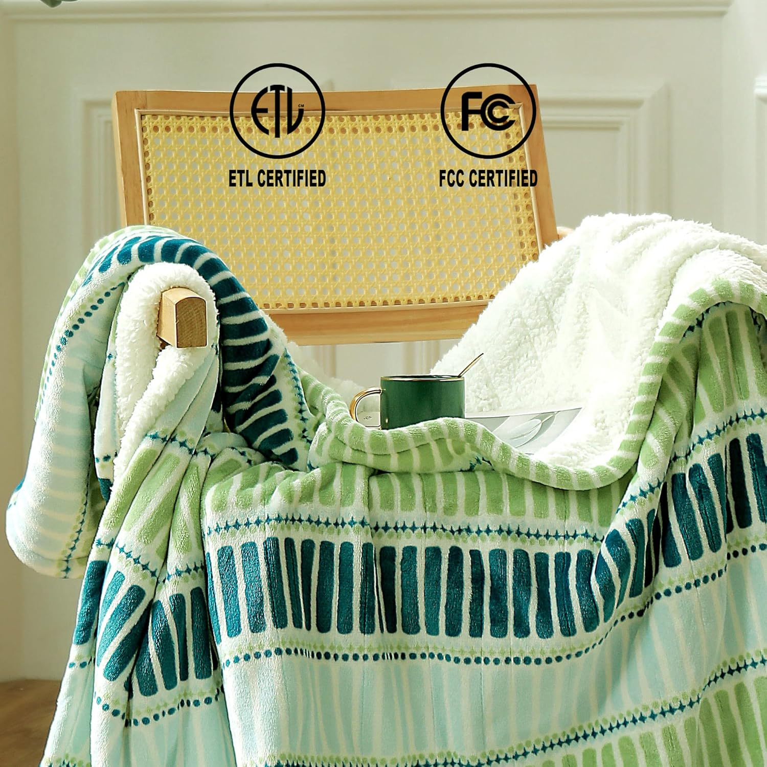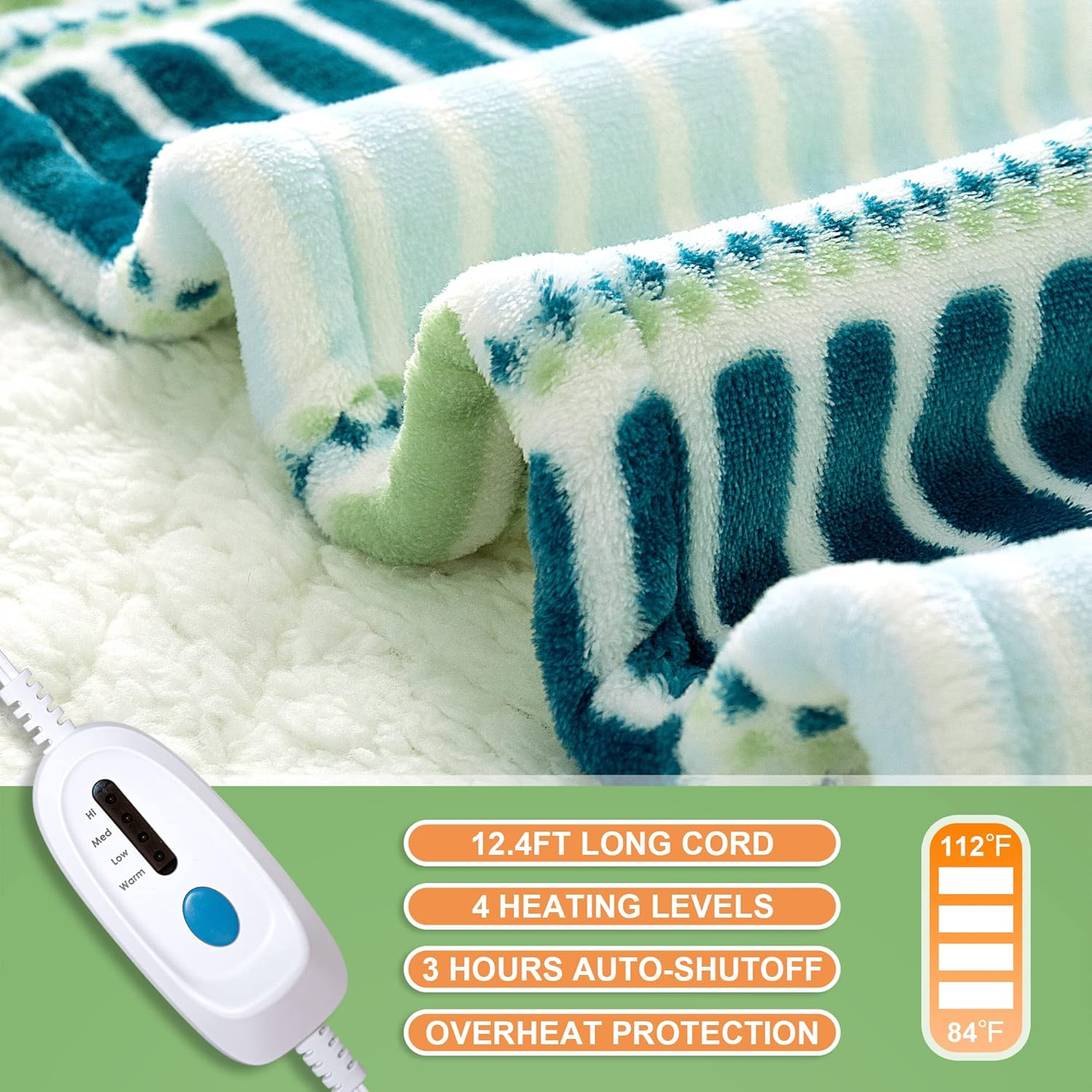 ※4 heat levels & Overheat Protection※ Our heated blanket throw has 4 heat levels for you to choose.You can choose the favorite set from 84℉ to 112℉.And this heated throw blanket won't be overheat,because it is designed with overheat protection,can shut off if it is too hot.Long power cord(9FT) allows you to use it conveniently.This heated blanket throw is double certified by ETL & FCC. ※Fast Heating and 3 Hours Auto-off※ Our electric throw blanket can heat quickly to keep you warm in the cold day.This electric blanket throw can shut down automatically after 3 hours of continuous use. ※Double-Side Design※ Our 50”x60” heating throw blanket is made of flannel & sherpa.The top fabric is printed soft flannel,and the bottom fabric is cozy sherp.This heating blanket throw can keep you warm and comfortable all day in the cold season. ※Machine Washable※ Our heated throw blanket is machine washable.Please remove the plug before washing. ※Perfect Gift for Your Family※ Our electric blanket throw can be used on the bed,on the sofa,can be used in the study and office.All in one blanket,it is a perfect gift for you family. Product Description All In One Heated Throw Blanket Bed Blanket Use our heated blanket throw to keep you warm when you sleep on the bed. Sofa Blanket Use our heated throw blanket when you watch TV with your family on the sofa. Knee Blanket Use our electric throw blanket to keep your knee warm when have a reading time. Nap Blanket Use our electric blanket for a nap at work and study in your office in the cold season.