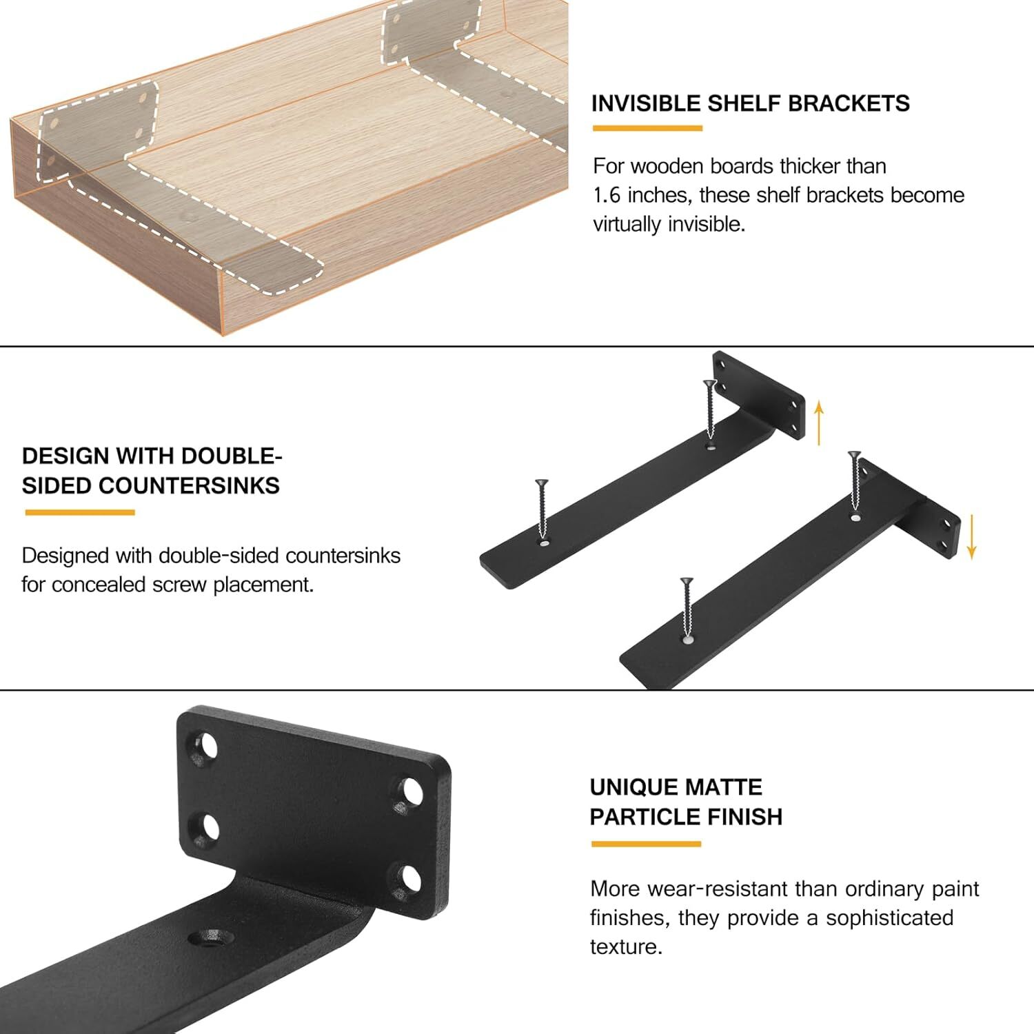 Store New Arrivals Add to Favorite View Feedback Contact Heavy Duty Floating Shelf Brackets, 10-Inch (1/5'' Thick) Hidden Shelves Hardware, Cast Iron L Brackets, Rustic Industrial Black Metal Wall Shelving Supports, 8 Pack Description Item model number ZJ-01 Part Number ZJ-01 Style 8 Pack Finish Matte Mounting Type Wall Mount Color Black Product Dimensions 10 x 6 x 2 inches Material Cast Iron Country of Origin China Item dimensions L x W x H 10 x 6 x 2 inches Item Weight 9.17 pounds Batteries Included? No Batteries Required? No Size 10 Inch Finish Type Matte Included Components not_applicable 【Heavy-Duty & 90° Angle】Each pair of the 1/5-inch thick brackets, crafted from high-quality steel, can support up to 150 lbs when used with the included high-strength screws. The precise bend ensures a perfect 90° angle, preventing any tilt. 【Hidden & Countersunk Design】With a height of just 1.6 inches, the bracket can be easily hidden between the wall and shelf. It's designed for both upward & downward use, while the countersunk feature guarantees smooth drilling and invisible screws. 【Matte Finish】The matte black finish on these cast iron shelf brackets mixes modern sleekness with industrial aesthetic. Serving as blind shelf supports, these mounting brackets offer a textured surface for rust resistance and lasting performance. 【DIY Storage Rack】This set includes 8 decorative L brackets for wood, perfect as holders for DIY wall-mounted open shelves. Versatile in application, they're suitable for kitchens, bathrooms, bedrooms, offices, garages, studies, and powder rooms. Step-by-Step Installation Guide 1.Mark Points: Identify where the holes will go and mark them accurately. 2.Insert Anchors: Use a screwdriver to secure the anchors in the drywall easily. 3.Attach Brackets: Use the long screws included to fasten the shelf brackets to the wall. 4.Repeat for Other Brackets: Follow the same steps to install any additional brackets. 5.Secure Planks: Finally, use the short screws to attach your shelf to the installed brackets. ABOUT US We offer the best prices around on high quality products. Our E-store includes media such as books, movies, music and games while offering electronics, toys, sporting apparel, clothing, tools, general home, garden items and more. SHIPPING We are always working hard to ensure your package arrives as soon as possible. Please understand that some factors like weather, high postal traffic, and the performance of shipping companies are outside of our control. We offer free shipping to the lower 48 states and ship within 2 business days of payment, usually sooner. We do not accept P.O. Boxes. Please provide a physical address. RETURNS We offer a 30-Day Return Policy on items which you are not completely satisfied with. You have the option for a full-refund or an exchange of the item. No returns are available on items shipped outside of the USA. PAYMENT We accept PayPal. CONTACT US This page content is yet to come Please ad us to your favorite seller and visit again later Thank You CUSTOMER SATISFACTION We try our very best to make sure every customer is completely satisfied. If there's a problem, message us! We're happy to help.