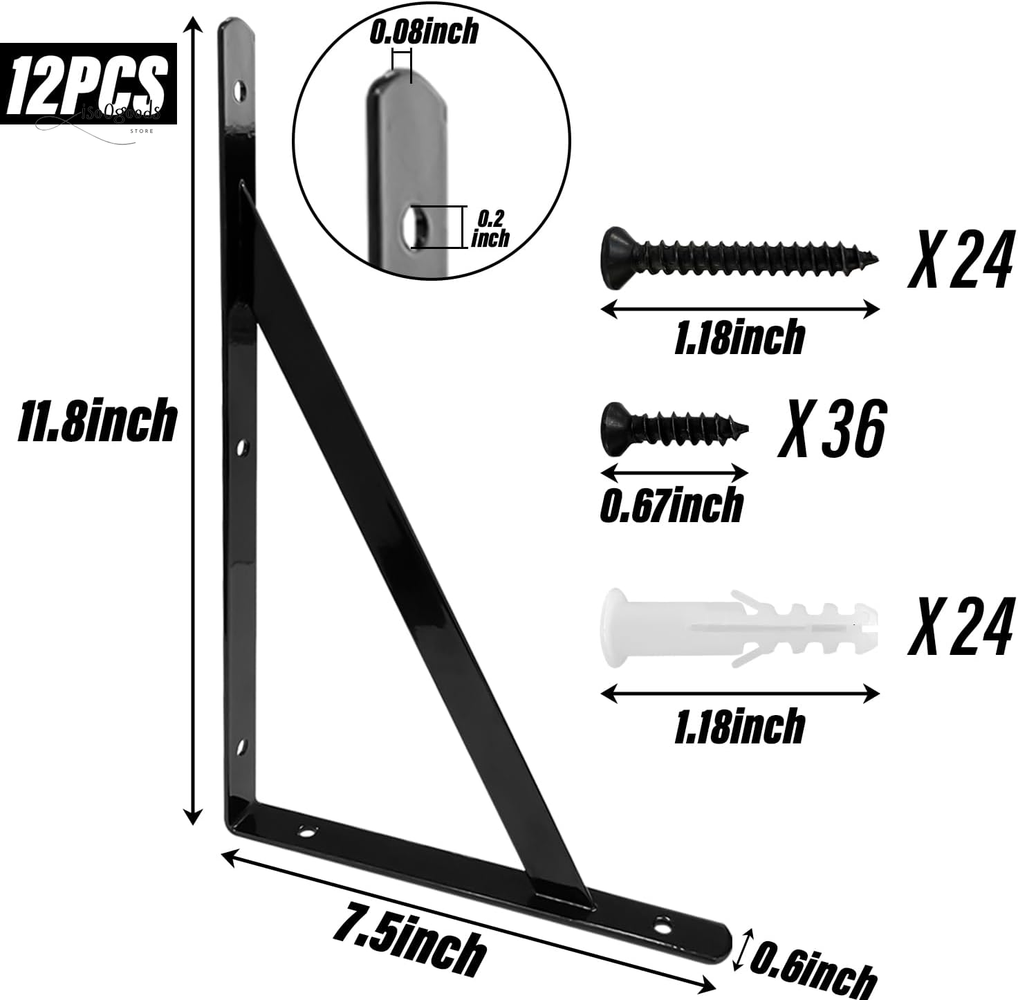 Upgrade Your DIY Projects with Heavy Duty Shelf Brackets! Package Includes: 12 x Brackets 24 x Long Screws 24 x Wall Anchors 36 x Short Screws Product Details: Size: 12" x 8" (L 11.8" x H 7.5" x W 0.6") Color: Black Coated Finish Thickness: 0.08" Weight Capacity: 110lbs per pair Supports Shelves: 12 inches to 16 inches deep Features: Triangle Design: Built with a 90-degree triangular structure to hold heavy items securely without bending. Premium Quality: Made from high-quality steel with a black powder-coating finish, ensuring durability and resistance to water and corrosion. Easy Installation: Pre-drilled fixing holes on each side and included screws make installation a breeze. Perfect for DIY floating shelving in your home, office, garage, kitchen, and more! With this rewritten description, your listing will be more engaging and likely to attract potential buyers on eBay. Plus, the emphasis on key features and benefits should help improve your search ranking!