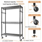 Sturdy & Long-lasting: The garment rack is made of high-quality iron pipe and is powder-coated to protect it from water and rust. This construction ensures stability, sturdiness, and durability. High Weight Capacity: With its dimensions of 17.7" D x 47.2" W x 83.6" H, the clothes rack has a total weight capacity of 1050 pounds when it is not being moved and 600 pounds when it is with wheels Sturdy And Long-lasting: The garment rack is made of high-quality carbon steel and anti-rust materials. The diameter of the pipe is 25.4 mm which is thicker than others, so that ensures stability, sturdiness, and durability Adjustable Shelves: The 3 tier clothes rack with wheels features two hanging rod and two sets of side hooks, providing versatile storage options. The height of the shelves can be adjusted to accommodate items of different sizes. This allows you to customize the storage space for shoes, hanging garments, and folded items Lockable 360 Degree Wheels And Multifunctional: This rolling clothes rack with 4 heavy duty rolling wheels, 2 of them are locking wheels,which ensure you can easily move anywhere you need, such as the entry closet, laundry room, hallway, balcony, bedroom, cloakroom, bathroom, garage, and more Easy to Assemble: It is important to carefully read the assembly instructions of the clothing rack and follow the steps. A rubber mallet is recommended for assembly (not included) . If you have any questions, don't hesitate to contact us and we will get back to you as soon as possible