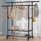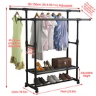 Heavy Duty Clothing Garment Rack Rolling Clothes Organizer Double Rails Hanging Please consider clearly before placing an order, the load-bearing capacity of this product is limited, only suitable for some light clothes, like summer clothes, winter clothes are not recommended to put more This Clothes Rack is made of high-quality material, stable and durable, waterproof and rust-proof. The multi-layer design can help to save space. Equipped with movable pulleys, it is convenient to move the rack, which can be placed indoors and outdoors. This item is also easy to use and simple to install. Tips: *Please read the instruction carefully or refer to the installation method in the video before assembling. *lf the goods are damaged or missing parts, please contact us in time to replace the new products, thank you. *Contact us please for whatever we can help. Specification: Type: 2-layer Garment Hanging Rack Color: Black Material: Steel-plastic composites pipe + ABS joints Size: As Picture Shows Size: *Slender long tube X2: Φ19mm; Long 750mm *Thick long tube X6: Φ25mm; Long 750mm *Long tube X4: Φ22mm; Long 750mm *Middle tube X4: Φ22mm; Long 370mm *Thin middle tube X4: Φ16mm; Long 740mm *Short tube X2: Φ22mm; Long 260mm *Straight tee X8 *Tube cap X6 *Base X2 *Connector X2 *Universal wheel x4 Installation steps: 1. Take 2 slender tubes, 2 plugs into the side of the base, and then take the thick 2 long tubes inserted into the baseabove. 2. First take 2 connectors and 4 thin tubes, put it together and put it into the thick tube, take 4 straight tees and 2 short pipes. 3. Take 4 long tubes, insert into the straight tee. 4. Take 2 thick long tubes, install straight tee at both ends. Then insert it into the long tube. 5. Take 4 middle tubes, insert into the straight tee respectively, take 4 caps to close the mouth of the tube. Assembly is completed. Feature: 【Extra Storage】 Double pole design, there are 2 poles for hanging, and you can adjustable the length and height according to your needs. The bottom shelf provides extra space for putting boxes, shoes, boots, pants, etc. And putting stuff in this area will help stabilize the coat rack. 【Movable Wheels】 The clothes hanger is equipped with 4 wheels making it easy for you to move this garment rack from your bedroom to your coatroom. 2 of the wheels are equipped with brake pads to lock it in place as you need. 【Easy to Assemble and Clean】 Simple installation. The coat rack can be quickly assembled with the parts provided according to the detailed instruction. Simply wipe with a cloth to clean the surface of the rack. 【Wide Range of Uses】 The clothes hanger can not only hang clothes, scarves and dresses, but also place shoes and storage boxes at the bottom. It is suitable for any place in your home without occupying too much space, whether bedroom, balcony, hallway, laundry room, entryway or closet. 【Great Service】 lf you have any questions about the product, please feel free to contact us by email, communication is often easier to solve the problem! -Equipped with removable pulleys, making it easy to move the rack. You can put it anywhere you want. -Made of high-quality material, sturdy composite pipe, which is waterproof, not easy to rust and durable. -With strong bearing capacity, it is eco-friendly, stable and has no odor. -Telescopic design, adjustable length and height, not limited by space, applicable to a variety of scenarios. Package Content: -1*Coat Rack Note: 1. lf you have any idea of return or exchange, please feel free to contact us by email, communication is often easier to solve the problem than return and negative comments! 2. The picture may be a little different from that of real item due to the different display and different light. 3. Due to different producing batches, product details might be a little different. If you mind the difference, please buy with caution. Thank you for your understanding. 4. Please allow minor differs due to manual measurement. Note: This item starts garment rack with 2 layer shoe racks after 2024.6.10,Thank you for your understanding and wish you a satisfying shopping experience.
