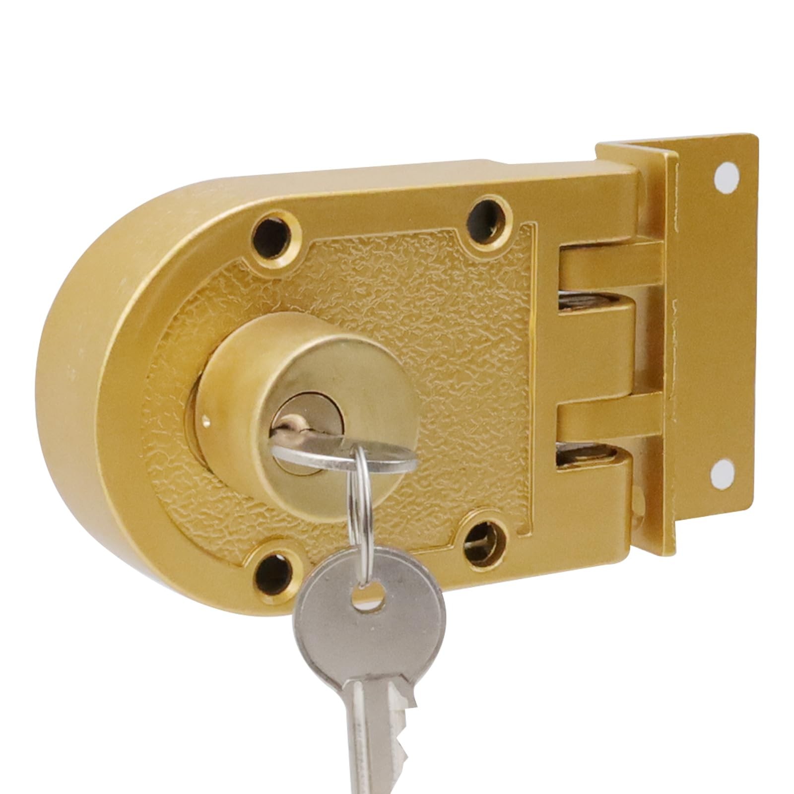 Specification: Net Weight:461g Color:Golden Material:Metal Main Body Size:109 x 73 x 46mm/4.29" x 2.87" x 1.81"(L*W*H) Package Includes: 1 x Jimmy Proof Deadbolt Lock Some Mounting Accessories Note: Due to the manual measurement,there may be small deviations. The color may have different as the difference display,please understand. Package Includes: 1 x Jimmy Proof Deadbolt Lock; Some Mounting Accessories. Fits door thickness between 1-3/8" to 2-3/8". Main Body Size: 109 x 73 x 46mm/4.29" x 2.87" x 1.81"(L*W*H). Surface installation requires one 1 1/4"(32mm) diameter holes keyed deadbolt. Hidden tamper-resistant shutter guard against force entry if cylinder is removed, provides added security to your home.