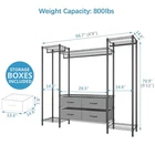 Return Policy Fast Delivery Trusted seller V20 Wire Garment Rack Heavy Duty Clothes Rack, Metal Clothing Rack with 6 Shelves, 3 Hang Rods & 4 Fabric Drawers, Compact Wardrobe Closet, 56.7" L x 14.6" W x 70.9" H, Black Product Description Package Included: 1 set garment rack, 4pcs fabric storage boxes. Dimensions & Load capacity : 56.7" L x 14.6" W x 70.9" H. Load capacity up to 800 lbs. Single hanging rod can support up to 75 lbs, Wire shelf can support up to 88 lbs for each. All-in-one Multifunction Closet Rack: 6 Tiers Garment Rack V20 with compact design offers you various storage area to place your clothes, accessories, shoes, etc. It features 6 height adjustable shelves for extra storage capacity, 3 detachable hanging bars that easily accommodates to the length and size of your garments and 4 fabric drawers with wooden handles which makes it easy to grab and pull from shelves. Sturdy & Reliable: Made of high quality iron pipe, and powder-coated to protect it from water and rust, makes it stable, sturdy and reliable enough to hold heavy garment pieces such as winter wear, gowns, handbags and footwear. Easy to Assemble: A rubber mallet is recommended, but it's not included. Just be sure to read the assembly directions carefully BEFORE you start putting it together. Certain shelves must be installed in a particular order. Shipping Returns Payment Shipping Shipping is FREE to all addresses other than APO/PO boxes in the lower 48 states. All our stock ships from US-based warehouses. Shipped via USPS or UPS (depending on location and package weight) Unless stated otherwise, all orders will ship within 24-72 hours of your payment being processed. Check our feedback to see the great reviews of FAST shipping we offer. Returns Seller does not accept returns Payment We currently accept payment via eBay managed payments only. Once payment is cleared, we will dispatch your shipment within 1-3 business days. Please refer to the "Shipping" tab for more information regarding shipping speed to your destination.