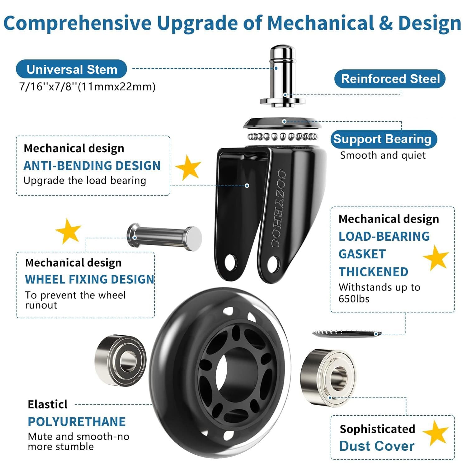 These heavy-duty caster wheels are a game-changer for my office chair! The smooth roll and sturdy build make moving around effortless, even on carpet. Perfect upgrade from the flimsy stock wheels—no more getting stuck or making noise. Highly recommend for anyone needing reliable replacements!