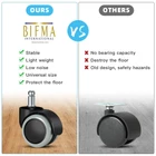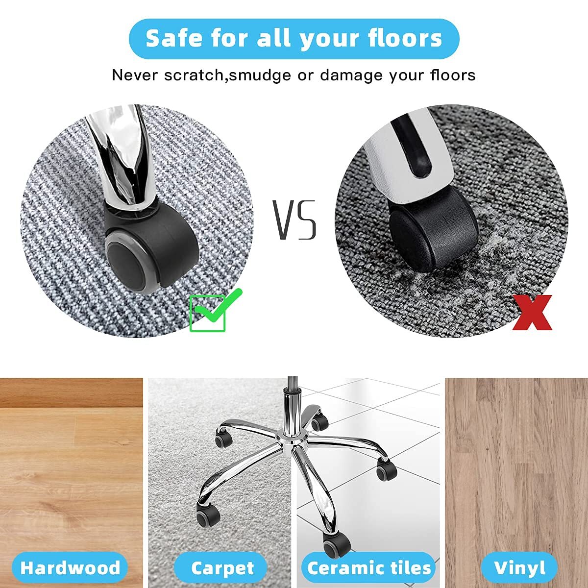 Is it troublesome because the chair wheels always make a clicking sound? Have you changed the wheels of your chair many times, making you feel exhausted physically and mentally? We have developed this unique and stylish wheel to fit most standard office and computer chairs and make your work easier. These casters we developed solve all the common problems of chair wheels and provide: smooth and silent rolling, Scratch-free floor, high load-bearing capacity (1000 lbs), easy installation and years of durability Scratches, scuffs, stuck wheels and noisy squeaks will be a thing of the past with our rubber caster wheels on your chairs. Install them quickly and easily (no tools required) simply pull off the old and snap in the new and you’re ready for sturdy support and stylish presentation. To ensure proper floor protection, floors should be kept clean and free of debris such as dirt, sand, or anything that can damage the floor surface if rolled over. Package included: Office caster x 5 Specification: Maxi weight capacity:1000lbs Color:Black Suitable floor style: Hardwood /Laminate /tiles/ Others High Quality: The office chair casters are made of high-quality polyurethane, wear-resistant, light weight, easy to and use, these casters can protect hardwood, laminate, ceramic tiles, slate and all other hard material floors from damage and scratches Applicability: Floor protection rubber office chair casters, suitable for most existing office chair models(salon chairs, executive chairs, work chairs, rolling stools) , easy to slide on the hard floor made of carpet and polyurethane material, very suitable for home or office use, and can be used for a long time Move Smoothly and Quietly: The office chair casters are always firm and easy to control when rolling. Five chair wheels are enough to support 1000 LBS, which is safe for a big man sitting on a rolling office chair. It is a good choice to choose our wheelchair wheels to upgrade your chair and bring you a quiet working environment Easy Installation: Quick and easy installation. The universal standard size can be used as a wheel for most work chairs and stools. Just pull out the old wheel and pop it out, then push the rod of the new office chair wheel into the slot until it is firmly fixed. It's like changing into a new chair High-quality Casters: This is a quiet/durable/sturdy office chair caster. Able to work well in the office