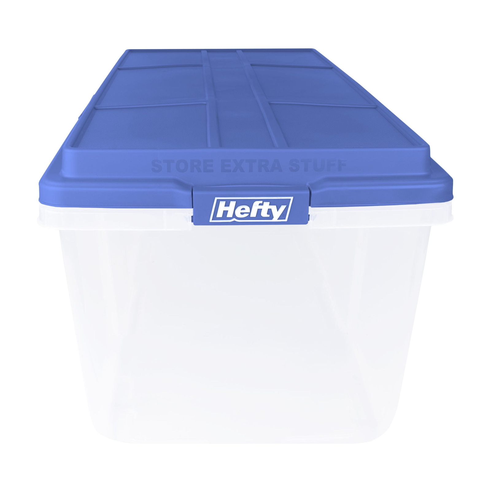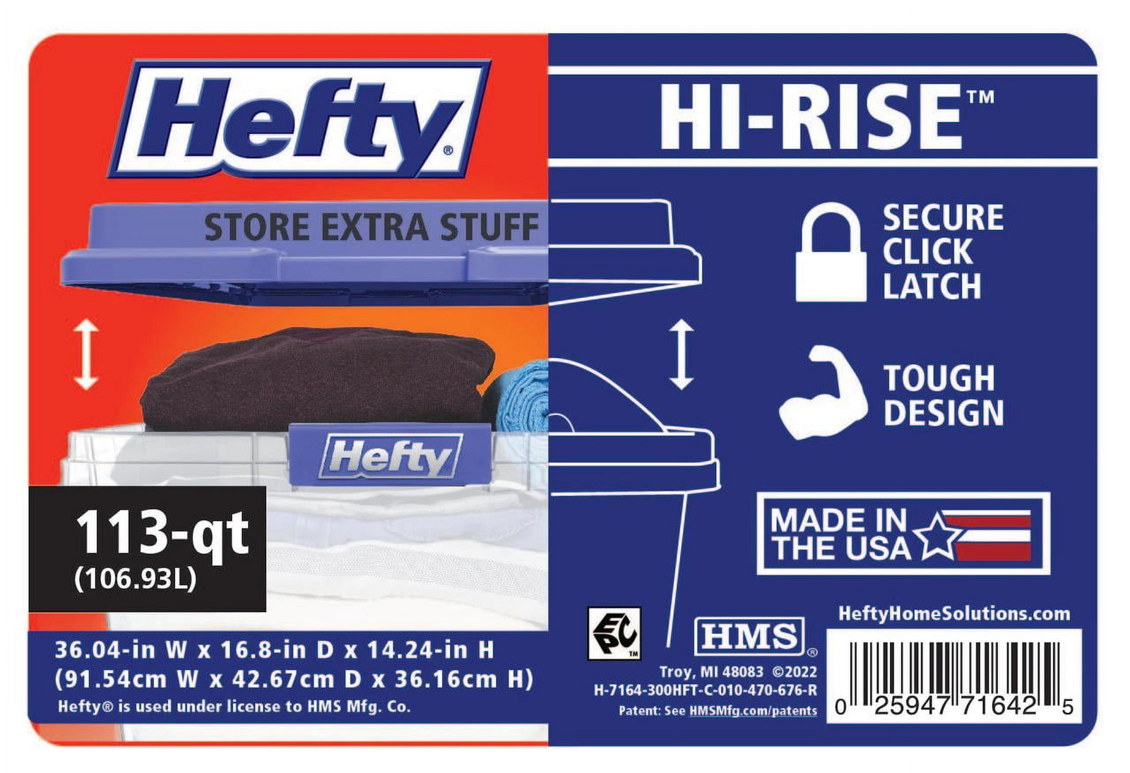 Looking for the best storage bins to organize your home or move to a new one? In search of a durable storage container to stow away anywhere in the home, garage, shed or attic? Look no further! The Hefty HI-RISE, 113 qt clear storage bin is designed to store a variety of household items including, gardening supplies, blankets & pillows, seasonal items and accessories. Ready to neatly STACK? Hefty’s HI-RISE patented lid design allows for secure stacking and ABOVE the rim storage, to efficiently save space within your home. A CLEAR view? Identify items quicker and more effectively with the HI-RISE clear storage base. The large, click secure latches allow for secure and comfortable transport. Work to maintain your storage space and organize your household with maximum containment. Store and better protect items to SAVE SPACE and edit your home or business. Check out the complete line of Hefty HI-RISE storage bins to help create a clean & uniform storage space! About this item Large secure latches, keep the lid closed tightly Double rimmed base for added strength Crossbar design on lid supports secure stacking Strong plastic storage container Taller, stackable lid allows for extra storage Hefty branded Adults, students, teens On Jul 29, 2025 at 23:56:09 PDT, seller added the following information:
