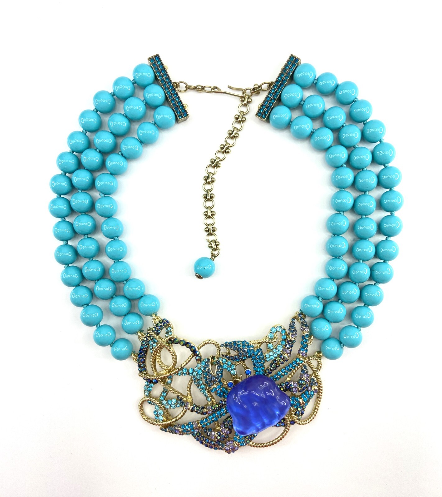 BRAND - HEIDI DAUS * LET'S HEIDI'S CRYSTAL-ENCRUSTED CRUSTACEAN GIVE YOUR EVERYDAY ENSEBBLES A SPARKLING LIFT * NECKLACE MEASUREMENTS - APPROX - 16-3/4"L x 1-1/4"W WITH 3-3/4" EXTENDER * DROP APPROX - 4-1/8"L x 3-1/4"W * CRYSTAL INFO - AQUAMARINE-COLOR, INDICOLITE-COLOR, CAPRI BLUE, TANZANITE-COLOR, JET-COLOR AB, MONTANA BLUE CRYSTALS, BLUE RESIN, TURQUOISE-COLOR GLASS BEADS * FINDINGS - NECKLACE - HOOK CLOSURE * OXIDIZED, TEXTURED FINISH The beads may have small scratches Condition: Brand New without tag. Sample or display use. There might be very tiny misplacement of the tiny crystals, if there is. There also might be tiny faint markings or slight scratches throughout metal. There might be a little difference of the colors due to the camera or light.