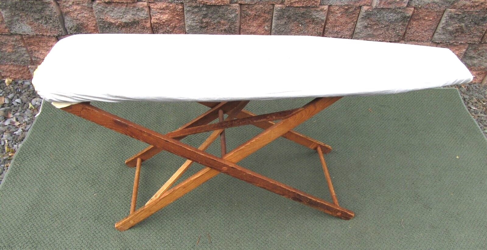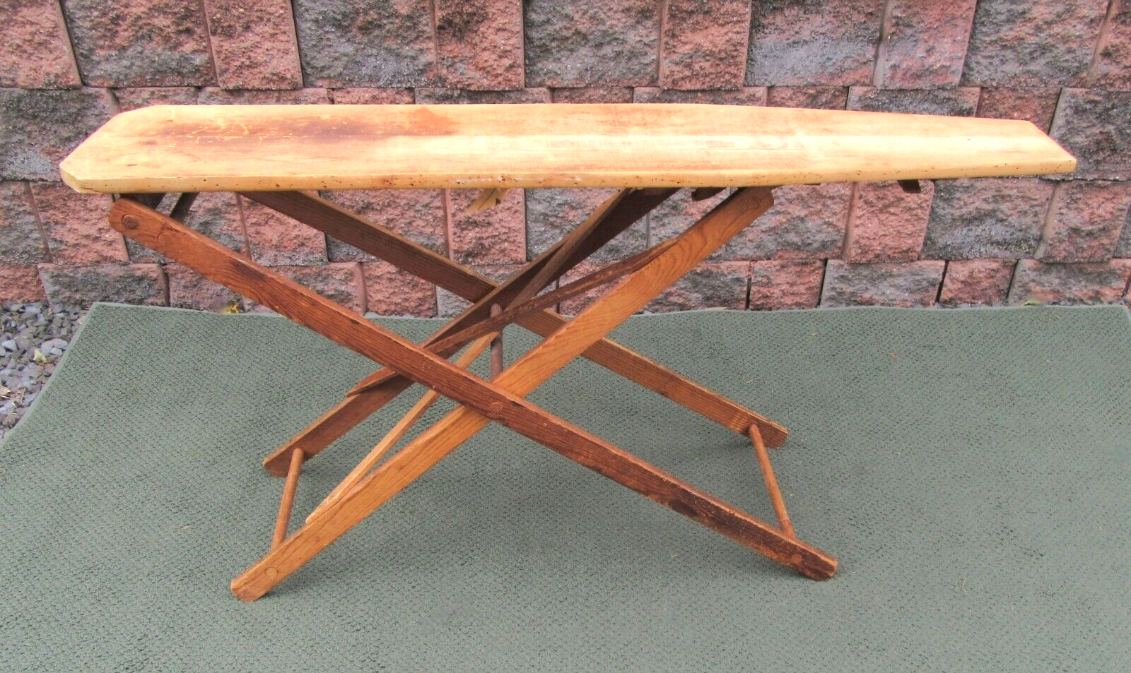 COUNTRY FOLDING WOOD IRONING BOARD We are offering for sale an antique country folding wood ironing board.. Exact age and origin unknown but appears early 1900s.. Solid and sturdy.. Great early design and craftsmanship.. Coffin shape wood top.. Adjustable height settings.. Came from an old Pennsylvania farm estate.. Great piece of history and remains functional.. See pics for details.. Thanks for looking.. CONDITION:: Overall good used vintage condition.. Solid and sturdy.. Shows some appropriate use wear, markings, distressing and age.. Selling as found.. All sales are final.. See photos for condition and details.. SIZE:: See Photos: Approx. 35.5"h@highest 28.5"lowest x 13"w x 55.5"L x 3"thick(when collapsed) SHIPPING:: Buyer to pay $ shipping/handling/insurance in the Contiguous 48 U.S. states. Hawaii, Alaska, Guam and Puerto Rico will be slightly higher. We welcome FREE local pickup on everything we sell. Pickup at 17020. For International buyers we use the Ebay Global Shipping Program. Picks4u Policies If you have any questions please ask prior to bidding.. This makes the buyer and seller more comfortable with the transaction.. We try to respond to questions within 24 hours.. PAYMENTS Paypal Preferred Cash upon pickup with prior approval.. Payments to be made within 5 days of auctions end unless other arrangements are made with our approval.. Pa residents to add 6% sales tax or provide valid tax number.. Items for pickup and delivery must be paid in advance.. SHIPPING SMALL ITEMS We ship immediately upon payment.. We use USPS priority mail or Fedex ground for shipping.. If buyer prefers a different route of delivery they must obtain prior approval and buyer is subject to any additional shipping charges.. We WELCOME FREE LOCAL PICKUP on any of our items at 17020.. LARGE ITEMS PLEASE BE SURE TO CHECK ON SHIPPING PRICES BEFORE YOU BID OR BUY SHIPPING IS NOT FREE We WELCOME FREE LOCAL PICKUP at 17020.. Please come prepared with blankets and items to help secure your item for transport.. Storage is FREE up to 6 months and longer with prior approval **We would be happy to work with a shipping company or independent shipper of buyer's choice.. Some recommendations and sites we have worked with are: USHIP and CitizenShipper Buyer responsible for making arrangements and paying the shippers directly for all shipping costs incurred.. RETURN POLICY We do our best to accurately photograph and describe all items, showing from all angles and pointing out any flaws in photos and description.. Due to the nature of most of my items being vintage, collectible and antiques the items are considered AS-IS.. All sales are final.. If item is not as described please contact us so we can resolve the issue amicably.. FEEDBACK We believe feedback is a very important part of Ebay transactions.. We leave feedback when the transaction is complete.. That means you, the buyer, has received your item and is satisfied.. We would very much appreciate the same.. Thanks for your business.. Greatly appreciated.. Have a WONDERFUL Day!