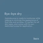 Hers Hydrobounce Instant Moisturizer - Squalane Moisturizer, All Skin Types Product Details HYDRATION: Meet your go-to moisturizer. Formulated for hydration, this lightweight yet ingredient-rich moisturizer supports healthy skin, day and night. Give skin the non-greasy hydration it needs to look and feel bouncy, moisturized, and healthy PLUMPS & SMOOTHES: Dermatologist-trusted ingredients that deeply nourish and hydrate. Hyaluronic acid helps skin retain moisture, which reduces the appearance of fine lines and wrinkles and promotes plump, healthy skin STRENGTHENS SKIN BARRIER: This paraben-free, cruelty-free, vegan formula contains Squalane which helps strengthens the skin barrier and helps with moisture retention for a plump and bouncy complexion SUPPORTS SKIN MICROBIOME: Our Probiotic moisturizer contains balancing microorganisms that help support and strengthen your skin microbiome USE DAY & NIGHT: Apply in the morning after cleansing or at night after cleansing to protect the skin’s natural barrier from irritation Product Description Item Volume 1.7 Fluid Ounces Active Ingredients hyaluronic acid,squalane Age Range (Description) Adult Special Feature Lightweight Package Dimensions 2.95 x 2.8 x 2.32 inches; 6.74 ounces Size 1.7 Fl Oz (Pack of 1) 2.8 inches x 2.95 inches x 2.32 inches. Weight: 6.74 oz Payment Details We accept all payments via Ebay using Credit Cards , PAYPAL , Apple Pay and many others Shipping Details We are always working hard to ensure your package arrives as soon as possible. Please understand that some factors like weather, high postal traffic, and the performance of shipping companies are outside of our control. Delivery & Return Policy Details We offer a 30-Day Return Policy on items in which you are not completely satisfied with. You have the option of a full-refund or an exchange of the item. No returns are available on items shipped outside of the USA.