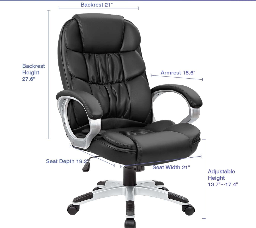 Office Chair High Back Computer Desk Chair, PU Leather Adjustable Height Chair Seat Plus: Upgraded sunken surrounded wide seat provides a most soft sitting experience. Padded Armrests: 18.6” super-long padded armrests are greater than the length of the forearm plus the hand, which give your arms maximum comfort. Ergonomic layering back: Streamlined back which fitted to the human spine provides the natural and comfortable sitting posture, layering design increases the level of appearance. Maximum capacity: 300lbs, Size of Back: 21"X27.6"(LXW), Size of Seat: 21"X19.2"(LXW), Adjustable Height: 13.7" to 17.4". Applicable Places: This office chair is suitable for the office and the study. It will make your space more modern and elegant.