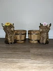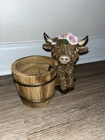 The product is a small Highland Cow figurine set from Hobby Lobby, made of brown resin. It features a farmhouse theme with a spring bucket planter design, ideal for home décor. The figurine is perfect for farmhouse, cottage core, or winter-themed decorations, and can be used during the Christmas or holiday season.