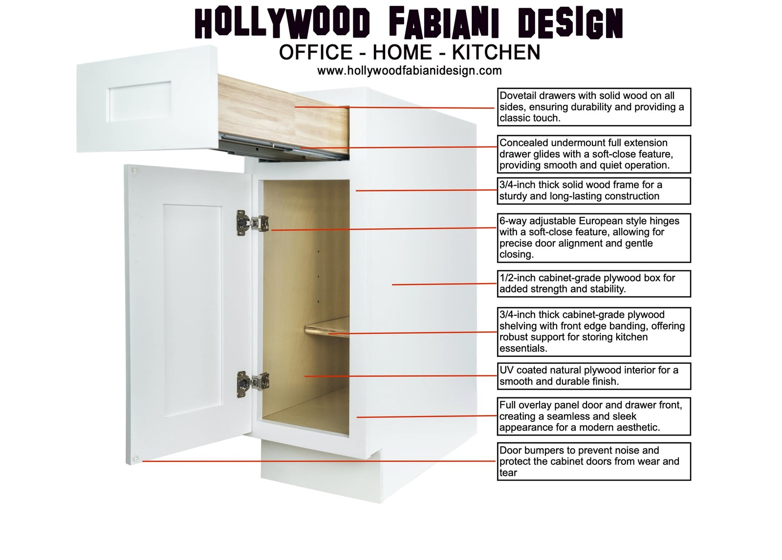 Crafted from real wood not particle board. Concealed undermount full extension drawer glides with a soft-close feature, providing smooth and quiet operation. 6-way adjustable European style hinges with a soft-close feature, allowing for precise door alignment and gentle closing. Door bumpers to prevent noise and protect the cabinet doors from wear and tear. 1/2-inch cabinet-grade plywood box for added strength and stability.