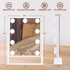 Suitable Size: The makeup mirror (11.8" L x 10" H) allow you to get your entire face in view at once. Large tabletop mirror is large enough to be used for makeup, grooming and even dressing. 360 degree rotation can be fixed in any position, providing you with a prime perspective Excellent Lighting: Featuring 9 dimmable LED bulbs and 3 color modes(daylight, cold light, and warm light), our makeup mirror with lights ensures you have just the right illumination for flawless makeup application Smart Touch Control: Make mirror with light has intelligent control and memory function. With the touch control feature, adjusting the brightness and color temperature is a breeze. The Memory function makes this lighted vanity makeup mirror with lights return to the same brightness it was on before being switched off Aluminum Frame & Prime Quality LED Bulbs: The Tabletop make up mirror with light Made of top materials, sturdy and durable. The pre-installed LED bulb has a life span of up to 50,000 hours, soft light protect your eyes Best Friendship Choice: Whether it's for family, friends, or loved ones, our mirrors are a great choice. Additionally, mirrors come in different colors for you to choose from, and you can purchase your favorite color according to your preferences