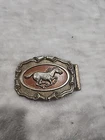 Embrace the spirit of the West with this ornately designed vintage belt buckle, featuring the majestic horse mustang that's come to symbolize American frontier spirit. Crafted in the 1980s, this piece is a true original, reflecting the craftsmanship and design of the era with its intricate metalwork and classic silver hue. Proudly made in the United States, it's a quintessential accessory for enthusiasts of cowboy and Western themes, perfect for adding a touch of vintage flair to any outfit. Its robust material ensures durability, while its unisex design makes it a versatile addition to any collection. Whether you're dressing up for a rodeo or just looking to add some Western charm to your wardrobe, this belt buckle is a timeless choice.
