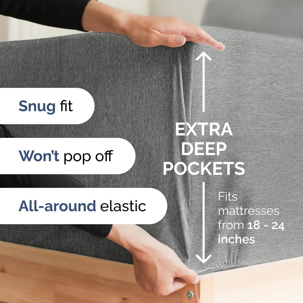 EXTRA DEEP POCKET KING SHEETS / EXTRA DEEP FITTED KING SHEETS: These bed sheets are for very deep pocket mattresses. They fit any mattress with pockets that are 18, 20, 21, 22 and 24 inches deep. There's stretchable elastic around the extra deep fitted sheet which stretches for a nice tug around your mattress. Perfect for extra tall & large mattresses. Rest assured these oversized sheets will stay on tight & stay in place! 6 PIECE SHEET SET: This bed sheet set comes with 4 pillowcases total all with a beautiful decorative embroidery design on each pillow case. The pillow cases have enclosure designs. This bedding set will accommodate your extra thick mattress perfectly. GREAT FOR DOUBLE PILLOW TOP MATTRESS: These bed sheets are perfect for mattresses with a 3 inch or 4 inch topper on top, memory foam toppers, big mattress pads, pillow tops, foam toppers, big foam toppers, pillow top mattresses and memory foam. These sheets will not come off. MICROFIBER: These are the softest type of microfiber bed sheets we have created. Super soft with a light feel. Not crisp like cotton. If you're accustomed to cotton sheets and you've never tried microfiber sheets we recommend you give these a try. They're even softer than cotton! DIMENSIONS & SIZES: Flat Sheet 111 wide and 102 long. Fitted sheet 78 wide and 80 long with 21 inch pockets (has elastic so it can stretch). All four pillow cases are oversized 20 x 40 inch. Product Description The video showcases the product in use. The video guides you through product setup. The video compares multiple products. The video shows the product being unpacked. Shop the CGK Linens catalog of luxury bedding products Add to Cart Add to Cart Add to Cart Add to Cart Customer Reviews 4.4 out of 5 stars 83,271 4.6 out of 5 stars 45,104 4.3 out of 5 stars 3,117 4.7 out of 5 stars 36 Price $59.99 $ 59 . 99 $13.99 $ 13 . 99 $49.99 $ 49 . 99 $192.00 $ 192 . 00 Fits Sizes 18 to 24 Inch Mattress 30" Length x 19" Height Twin, Full, Queen, King 18 to 24 Inch Mattress Triple Embroidered Pillowcases Triple Embroidered Triple Embroidered X Triple Embroidered Envelope Enclosure Pillowcases Envelope Enclosure Envelope Enclosure X Envelope Enclosure OEKO-TEX Certified Yes Yes Yes Yes Product Care Machine Wash Machine Wash Machine Wash Machine Wash Wrinkle Proof Yes Yes Yes Yes Fade Proof Yes Yes Yes Yes Stain Proof Yes Yes Yes Yes