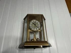 This Howard Miller Clock is a vintage/retro styled anniversary/torsion clock that features a brass frame and quartz movement. It is battery-operated and has chimes. The clock is in good working condition and is perfect for adding a touch of vintage charm to any space.