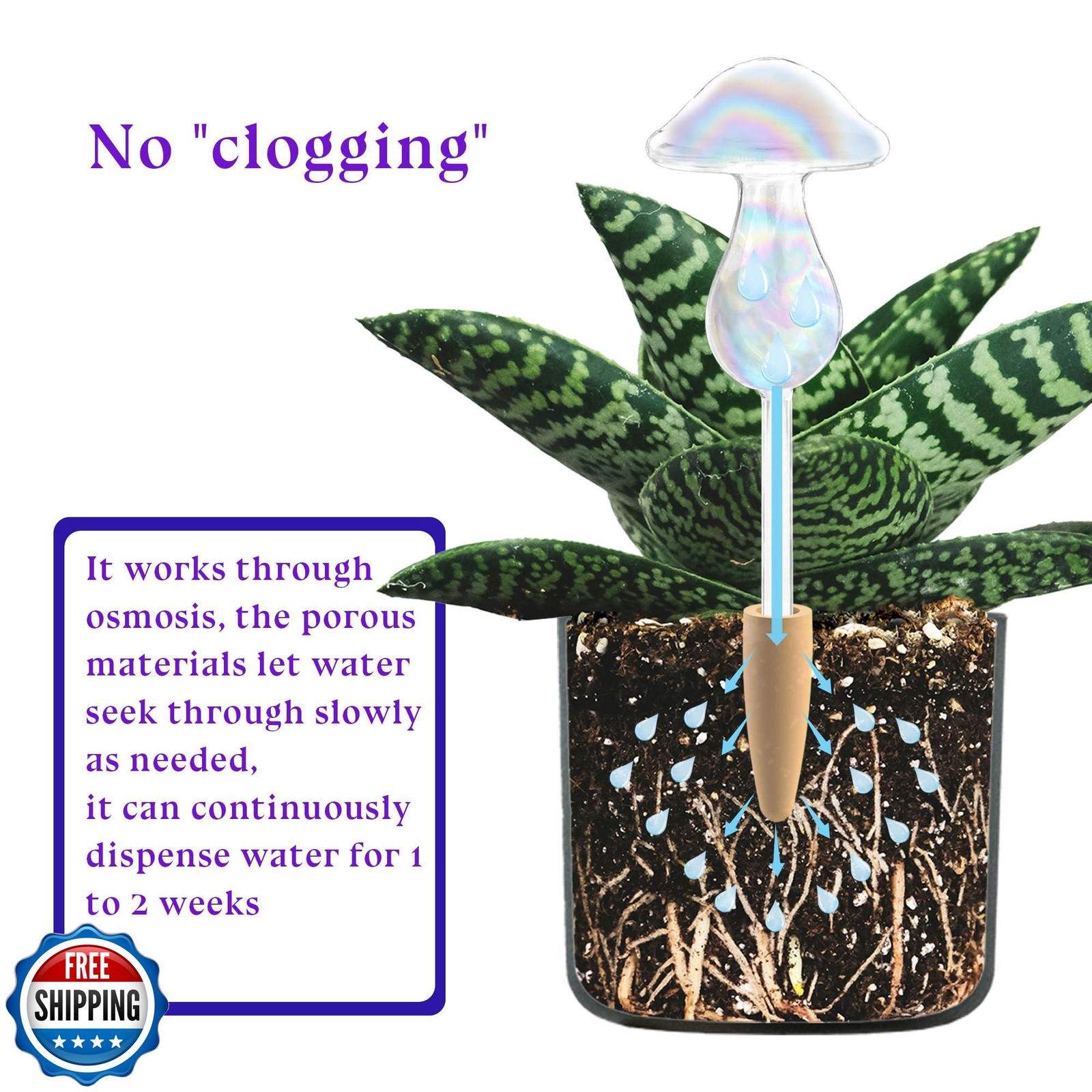 HyJeryty 3 Pack Non-Clogging Iridescent Mushroom Plant Watering Globes Plant Watering Devices, Hand Blown Glass Self Watering Planter Insert Self Watering Spikes Bulbs for Indoor and Outdoor Plants Features 【No Clogging, No Need to Wrap The Spout with A Cloth Any More】Since It works through osmosis, the porous material will prevent dirts from getting into the globes, you don't need to wrap the spout with a cloth any more 【PATENTED Way to Work】It works through osmosis, the porous materials let water seek through slowly as needed, it can slowly release water for 1 to 2 weeks( the porous materials are free to offer, inside the carton box ) 【More Convenient to Use】Only 2 steps to use it, 1: dig a hole, insert the spike 2: fill the globes, put it into the spike 【Cute appearance】Shaped in shimmery glass construction, the mushrooms are cute and add a touch of whimsy to any potted plant 【Gorgeous Coloring】The iridescent coloring isn't so bright and noticeable, but the iridescent appearance really add something special to a beautiful plant, they blend in with any color or plant but have a little panache, look superb when the light hits them 【Wide range of use】They are pretty as home decoration, also a great addition for plant lovers; they can be placed in a pot and given as a gift to someone Shipping Free & Fast Shipping: We offer free shipping to most of the USA with a normal delivery time of 3-7 days. However, due to the current situation, additional delivery time (up to 3 weeks) may be required for some items. Alternative Carriers: We may use alternative carriers (e.g., USPS, FedEx, UPS) to ensure your package arrives safely and on time. Due to the use of multiple carriers, we are unable to provide a tracking number automatically. Handling Time: Orders are processed and shipped within 1-2 business days of receiving cleared payment. Shipping Restrictions: Shipping to Alaska, Hawaii, Puerto Rico, Guam, and other US territories may incur shipping charges or delivery restrictions. Please contact us before ordering, or your order can be refunded/cancelled. State Restrictions: Certain items may not be shipped to California due to state regulations. Contact for Tracking Updates: If you require tracking updates or have any concerns about the delivery of your order, please feel free to contact us, and we will be happy to assist you. Return Policy 30-Day Hassle-Free Returns: If you are not completely satisfied with your purchase, you can return the item for free within 30 days of receiving it for a full refund or exchange. Easy Return Process: Contact us, and we will provide you with a prepaid return shipping label and detailed instructions. No Restocking Fee: There are no restocking fees for returns. However, the buyer is responsible for return shipping costs if the return is not due to a seller's error. Refund Processing: Refunds will be processed within 1 business day of receiving the returned item in its original condition. Feedback Your feedback is extremely important to us. We strive to provide the best products and customer service possible. If you are satisfied with your purchase, please take a moment to leave us a positive review. If you have any concerns or issues with your order, please contact us before leaving negative feedback. We are committed to resolving any problems and ensuring your satisfaction. Contact Us If you have any questions or concerns, please feel free to reach out to our customer support team. You can contact us through the eBay messaging system. We are available Monday to Friday, 9:00 am to 5:00 pm EST, and we will do our best to respond to your inquiry within 24 hours. Thank you for supporting our small family business!