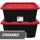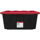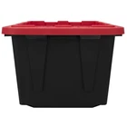 Product details Organize clutter and hide unused items with the Hyper Tough 27 Gallon Snap-Lid plastic storage bin featuring a black base and red lid. This durable plastic container is built from long-lasting polypropylene to resist rust, dents, stains, and peeling perfect for daily use indoors or outdoors. This storage box is ideal for everything from seasonal gear and sporting equipment to gardening tools and pet supplies. The red snap lid not only adds a pop of color but also provides a secure 2-point closure, making this one of the most reliable storage bins with lids. The specially molded lids for storage bins are designed for easy stacking, giving you stackable storage bins that maximize your space. Whether you're storing items in the basement, closet, shed, attic, or garage, this versatile storage tote offers a clutter-free solution. It's also great for organizing kids’ toys use it as one of your go-to toy boxes or storage containers for games and gear. The six built-in tie-down holes make the lid lockable with zip-ties or padlocks, giving you a secure outdoor storage box or patio storage box when needed. Use it to store shoes, clothing, tools, or hobby supplies—this all-purpose storage container storage solution handles it all. Tough black plastic construction resists rust, dents, stains and peeling to ensure lasting use Stackable lid design creates stability and reduce toppling when multiple units are stacked Snap-Fit Lid lip keeps your content from spilling or falling out Lockable Lid comes with 6 holes ideal for zip-ties or padlocks to keep your items safe and secure Exterior Dimensions - 30.6 IN W x 20.6 IND x 14.3 IN H (77 .7 cm x 52.3 cm x 36.3 cm Easy to clean surface Indoor or Outdoor use, Made from recycled materials Reusable Set of 1 – Includes 1 black base and 1 red lid Weight – 6.6 lbs Available in multiple sizes: 5 Gallon, 12 Gallon, 17 Gallon, 27 Gallon, 40 Gallons and 50 Gallons