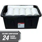 Product details The Hyper Tough 27 Gallon Stackable Snap Lid Plastic Storage Bin Container offers a spacious and durable solution for home storage needs. Made from recycled plastic, it's designed to withstand various environments like basements, closets, and sheds. The red snap-lid ensures secure closure with a 2-point locking mechanism, keeping contents safe from dust and pests. Its stackable design with molded lids prevents toppling and maximizes vertical storage space. Convenient handles facilitate easy transport between rooms. Equipped with 6 tie-down holes, it allows for additional security using zip-ties or padlocks, ideal for storing valuables. This versatile tote is perfect for organizing household items, gardening supplies, and seasonal gear. Tough black plastic construction resists rust, dents, stains and peeling to ensure lasting use Stackable lid design creates stability and reduce toppling when multiple storage bins are stacked Snap-Fit Lid lip keeps your content from spilling or falling out Lockable Lid comes with 4 holes ideal for zip-ties or padlocks to keep your items safe and secure Semi fluted sides add strength when stacked Exterior Dimensions - 30.6 IN W x 20.6 IND x 14.3 IN H (77 .7 cm x 52.3cm x 36.3 cm) Easy to clean surface, Indoor or Outdoor use Tie down grooves for straps Made from recycled materials Reusable Set of 4 – Includes 4 black base and 4 red lid Weight – 6.6 lbs per tote