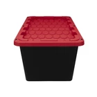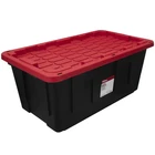 Organize clutter and hide unused items with the Hyper Tough 40 gallon snap-lid plastic storage tote. Made of durable polypropylene, the black storage tote allows you to hide away things you don’t want to be seen while the red snap-lid adds a pop of color to your space. The 2-point snap-lid ensures your items are safely secure during storage or transport. The specially molded lid allow you to stack multiple totes on top to prevent toppling and maximize storage space. Protect your valuable by utilizing the 6 tie-down holes made for zip-ties and padlocks. The long lasting Hyper Tough tote works great in basements, closets, pantries, sheds, barns, and attics. This tote is great for organizing household products, gardening supplies, pet treats and supplies, shoes, clothing, seasonal gear like boots, sporting equipment such as golf balls, tennis balls, or drill cones, and many other items. Sturdy black plastic construction resists rust, dents, stains and peeling to ensure lasting use Stackable lid design creates stability and reduce toppling when multiple storage bins are stacked Snap-Fit Lid lip keeps your content from spilling or falling out Lockable Lid comes with X holes ideal for zip-ties or padlocks to keep your items safe and secure Exterior Dimensions - 38.2 IN WX22 IN DX 16.4 IN H (97 cm x 55.9 cm x 41.6 cm) Easy to clean surface Indoor or Outdoor use Made from recycled materials Reusable Set of 1 – Includes 1 black base and 1 red lid Weight – 9.3 lbs