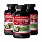 COCONUT OIL 3000 MG PURE AND POTENT INGREDIENTS IMMUNE AND BRAIN BOOSTER EXTRA VIRGIN Manufactured For Health Solution Prime Made in USA 1 Bottle, 60 Softgels BENEFITS: Boost immune system Cares your digestion Prevents premature aging of skin Fat burn and healthy weight loss Blood pressure support Detox and cleanse Cares your hair and skin Antibacterial About Coconut Oil "Tree of Life" Each and every part of the tree is used for one thing or the other. Its uses range from cosmetics to food and it is part of the diet in the tropic and subtropic regions. The fibrous husk is used to make coir ropes and mats, the shell is used for charcoal and the fruit is used for oil as well as in diet. Coconut water is one of the healthiest drinks on the planet. This sweet liquid is present in the young, green coconut. Coconut is a drupe and it has three layers: endocarp, mesocarp and exocarp. It is often described as a superfood as it has many health benefits. Coconut oil is rich in healthy fatty acids like capric acid and lauric acid. It also contains healthy saturated fat. The fat in coconut oil is easier to digest, has anti-fungal and anti-microbial properties and are not stored as fat readily. Coconut oil is used mainly in tropical countries but is now gaining popularity across the world. This oil contains three unique fatty acids that are responsible for its various health benefits: lauric acid, capric acid, and caprylic acid. These are some of the rarest substances found in nature and the reason why this oil is so beneficial. In addition, coconut oil also contains linoleic acid, oleic acid, phenolic acid, myristic acid, Vitamin E, Vitamin K, and iron. Coconut oil benefits a) May Protect liver and cares kidney infection . The medium-chain fatty acids present in coconut oil are known to have antibiotic properties. It kills the bacteria by destroying the lipid coating on it. b) Helps burn fat and lose weight The fatty acids in coconut oil help in burning more calories and losing weight. According to a research, coconut oil helps in reducing the abdominal fat in women. It also boosts metabolic rate of the body and this helps in burning more calories. c) Improves brain function Coconut oil boost memory in older people. F atty acids are readily absorbed by the body and they fuel the cells of the brain, helping them to function efficiently. d) Boosts immunity Lauric acid in coconut oil helps in fighting bacterial infection. Lauric acid creates an environment in the body that is toxic for the viruses. The healthy fats in coconut oil support immune. Coconut oil helps to suppress inflammation while supporting healthy metabolism. f) Helps in preventing bones problems Coconut oil is rich in antioxidants, which fight the free radicals. One of the main causes of bone problems is free radicals and coconut oil is a natural care for the condition. Coconut oil also improves the calcium absorption by the body. g) Heart health The main saturated fat in coconut oil is lauric acid. This type of saturated fat is shorter in length than other saturated fats. Lauric acid can be considered a medium chain triglyceride which acts differently in the body than longer saturated fats. Coconut oil, like other plant-based oils, does not contain cholesterol. The vast majority of the fats in coconut oil are medium chain triglycerides. These medium chain fatty acids found in coconuts have tremendous health benefits and are easy for the body to burn as fuel for energy. Coconut oil also contains antiviral, antifungal, antibacterial, and antimicrobial properties. SUPPLEMENT FACTS: Serving size: 3 softgels Servings per container: 20 Organic Virgin Coconut Oil 3000 mg Calories 26 Calories from Fat 41 Total Fat 3 g 5% Saturated Fat 2,6 g 12% Transfat 0 g 0% Monosatrurated fat 0,075 g Cholesterol 0 g Total Carbohydrate 0 g Protein 0 g Daily Value not established Other ingredients: Gelatiune and Purified water *These statements have not been evaluated by the Food and Drug Administration. This product is not intended to diagnose, treat, or prevent any disease. PREMIUM QUALITY PRODUCT