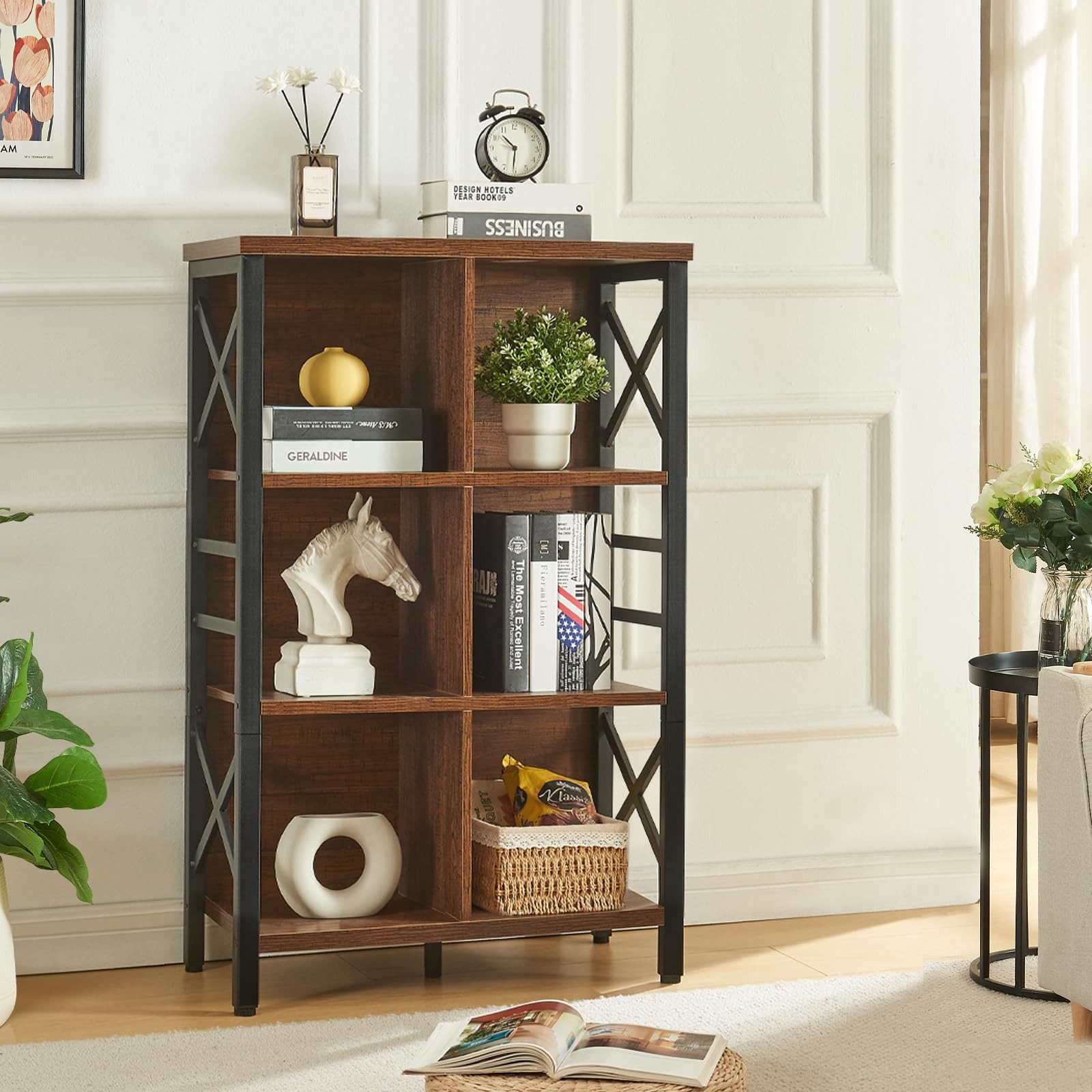 Bookcase Unique shape: This 6 cube storage organizer has a unique shape design. The side X shape and double cross bar design are full of strong industrial style and help prevent accidental dropping of items and improve safety, and the front cross cross partition construction gives the product a simple and atmospheric appearance. The combination of brown wood and black metal frame makes the cabinet look calm and not monotonous. Its presence will become a different kind of artistic atmosphere in your home. Multi-functional bookshelf: Thanks to excellent materials and design, this cube bookshelf has multiple functions. It can be used as a bookshelf in the living room, a display shelf at the entrance, a storage shelf next to the TV, a storage cube in the bedroom. According to your requirements to meet your different storage needs. Ample storage space: The overall size of this cube bookcase is 25.6 "W*12.6D" *41.5 "H. There are 6 separate storage Spaces with each storage space 11.7 "*11.7" *11.3 ". It can be used with 11*11 boxes for storage. Plenty of space makes it great for storing books, decorations, and other essentials, the open design keeps everything within reach, and it keeps everything neat and organized. It is a stylish and practical item for any room. Stable and durable: The cube storage shelf is made of high-quality materials and MDF. The thickened top and bottom planks greatly increase its load-bearing capacity. The sturdy X shape and cross bar structure ensure the shelf is stable and durable, and the adjustable foot at the bottom prevents it from shaking on uneven ground. Easy assembly: No need to hire a professional handyman! This bookcase comes with instructions and all the necessary tools, making it a breeze to assemble. Let you spend less time on complicated instructions and more time enjoying your locker.