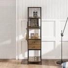 Product Description About this item 2-in-1 Dog Furniture: Our pet bookshelf seamlessly blends functionality with aesthetic design. Not only does it serve as a storage space for books and decorations, but it also includes a feeding spot for your pet. This creates a cozy living environment for both you and your furry friend. Pet-Friendly Features: The bottom shelf includes 2 dog bowls for convenient and easy feeding. For an optimal pet-friendly setup, recommended pairing it with our metal bookshelf equipped with a pet crate(带狗笼asin), allowing you to craft the perfect living space for your beloved companion. Selected Material: Crafted with a sturdy metal frame and reinforced with thickened P2 grade melamine board, this rustic brown bookshelf features a waterproof and easy-to-clean surface. It provides you with a sustainable storage option. Structural Stability: Adjustable feet at the base adapt easily to uneven floors, ensuring structural stability in any setting. Additionally, for an added layer of security, the standing shelves come equipped with an anti-tip device, safeguarding against potential accidents. Multi-scenario Use: Whether serving as a sophisticated bookcase in the study room, a stylish storage shelves in the living room, or a practical pet feeding Dog and Cat Furniture