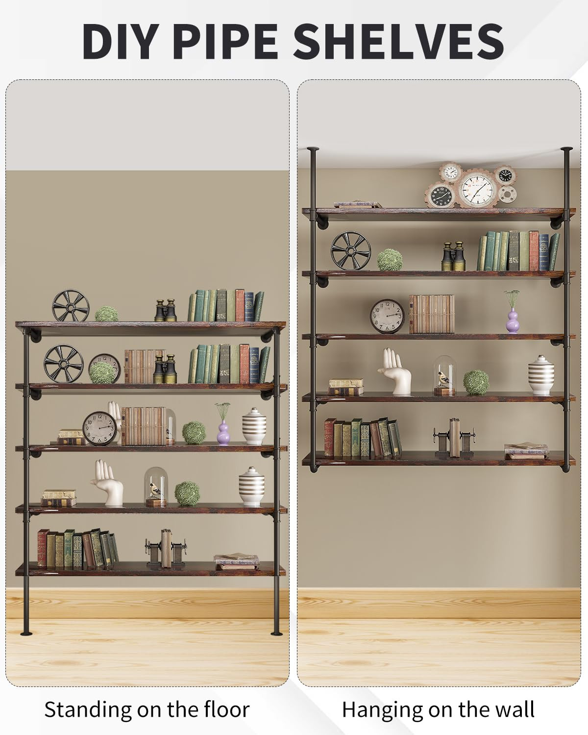 STYLISH CONTEMPORARY DESIGN - Our wall-mounted pipe shelf has a contemporary design with its unique look and build. These vintage bookshelf brackets make your wall look more spacious. SPACE-SAVING STORAGE SOLUTION - This pipe shelf brackets won’t take any floor space. It’s perfect for small spaces and tiny nooks. Now you can have a mess-free home or workplace! DIY OPEN SHELVING MADE SIMPLE - Easily set up a 5-tier pipe shelving brackets. Our kit is complete with 20 cast iron pipes, 12flanges, 8 tees, and 2 elbows. Wood planks are NOT included BUILT TO LAST - Made of 100% iron, our brackets are stable and extremely sturdy. These iron pipe shelves are built to stand the test of time! No need to deal with costly repairs or replacements. SEVERAL WAYS TO USE IT - This iron pipe shelf bracket set isn't just a bookcase. Use it as pantry storage, living room display, open cabinet, or bathroom towel holder. Showcase your personality!