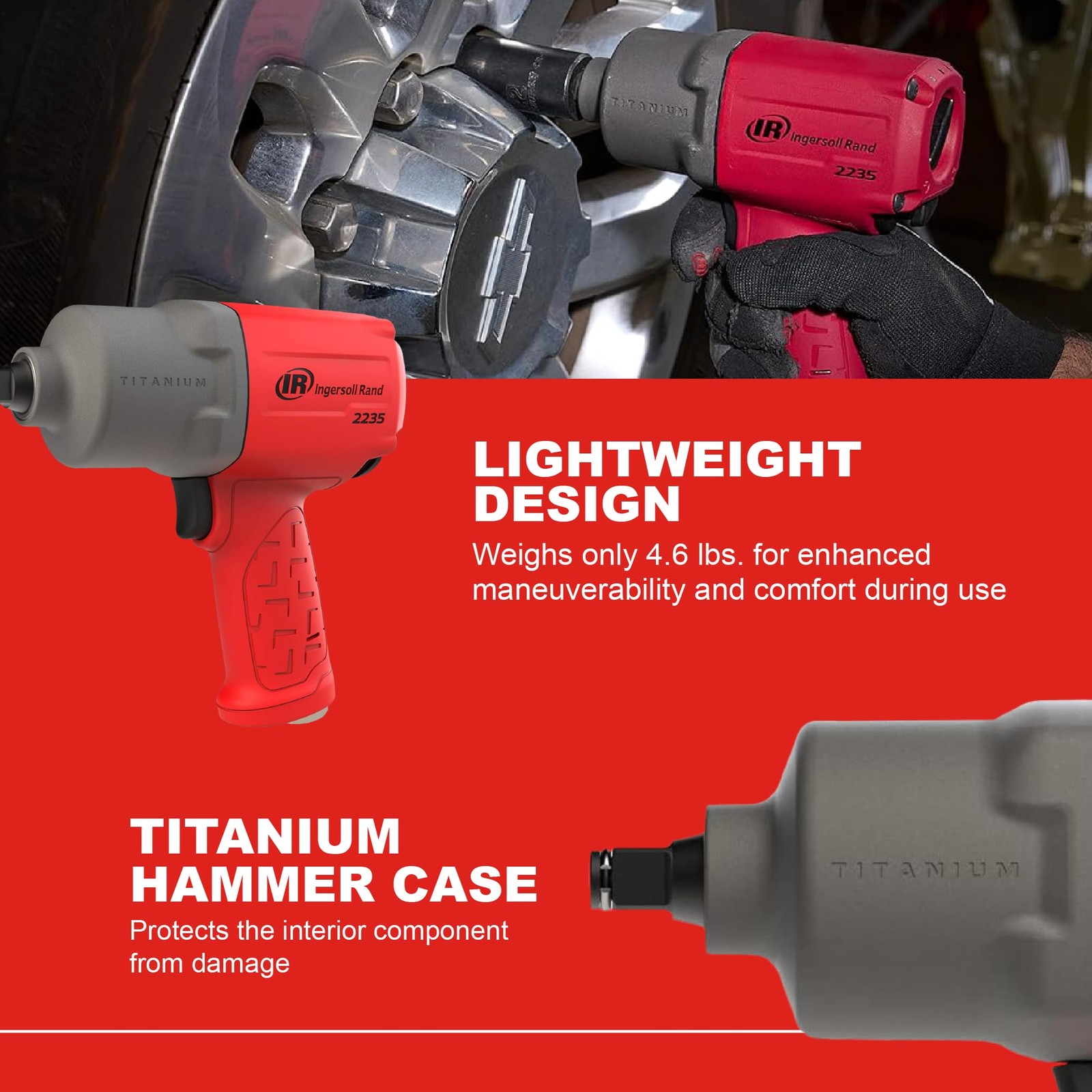 Ingersoll Rand 2235TiMAX-R 1/2" Drive Air Impact Wrench, Lightweight 4.6 lb Design, Powerful Torque Output up to 1,350 ft-lbs, Titanium Hammer Case, Max Control, Red RELIABLE POWER WRENCH: Tackle the toughest bolts with ease using this air impact wrench. It features a twin-hammer impact mechanism to provide an impressive 1,350 ft-lbs of nut-busting torque. CONVENIENT IMPACT WRENCH: This powerful 1/2" Drive Air Impact Wrench features a lightweight design that weighs only 4.6 lbs, providing enhanced maneuverability and comfort during use. HEAVY-DUTY IMPACT WRENCH: Our wrench is built for reliability to ensure optimal performance. It features a striking design for quick and easy identification when it’s time to work. IMPRESSIVE FEATURES: The wrench’s titanium hammer case protects the interior components, while the impact- and chemical-resistant housing safeguards against repeated drops and chemical exposure. UNLOCK YOUR POTENTIAL: For 160 years, Ingersoll Rand has been committed to making life better by creating innovative, durable, and quality tools. Our legacy is reflected in every product we make. Shipping We offer FREE shipping on all orders! We ship within Three business days of payment, usually sooner. We use a selection of shipping services such as UPS, FedEx, USPS etc. We only ship to the lower 48 states, no APO/FPO addresses or PO Boxes allowed. Local pickups and combined shipping options are not provided at this time. Return You can return a product for up to 30 days from the date you purchased it. Any product you return must be in the same condition you received it and in the original packaging. Please keep the receipt. Payment We accept payment by any of the following methods: PayPal Please pay as soon as possible after winning an auction, as that will allow us to post your item to you sooner! Feedback Customer satisfaction is very important to us. If you have any problem with your order, please contact us and we will do our best to make you satisfied. Contact Us If you have any queries, please contact us via ebay. We usually respond within 24 hours on weekdays. Please visit our eBay store to check out other items for sale! Thank you for shopping at our store.