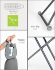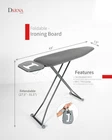 About this item Foldable Design: This ironing board features a compact, foldable design for easy storage and portability. Extendable Length: Adjustable length from 27.5" to 35.5" accommodates garments of various sizes. Heat-Resistant Fabric: The surface is made of heat-resistant fabric, ensuring safe and efficient ironing. Thick Padding: The 9mm thick sponge padding provides a smooth, cushioned ironing surface. Comfortable Ironing: The ergonomic iron holder allows for comfortable and convenient ironing. Streamline your ironing routine with this foldable ironing board from Darna. Its compact and portable design makes it a space-saving solution for small living spaces or travel. The board extends from 27.5" to 36" to accommodate various garment sizes, providing ample surface area for efficient ironing. Featuring a heat-resistant fabric cover, a 9mm thick sponge layer, and an electrostatic epoxy powder coating, this ironing board offers durability and functionality. The comfortable iron holder keeps your iron securely in place. With its sturdy yet lightweight construction, this ironing board is easy to set up and store away when not in use, making it an essential household item for effortless garment care.