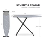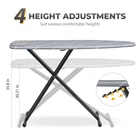 53”L x 13”W Ironing Board: Reduces garment repositioning; ideal for long pants, with a heat-resistant mat for safe iron placement Reinforced Metal Mesh: Stable mesh surface ensures even heat for faster, smoother ironing without fabric sticking Adjustable Height: Four height options (30-36 inches) reduce back strain, with secure slot locks for stability 3-Layer Removable Cover: Features 5mm polyester padding, eco-foam, and premium cotton for a heat-resistant, scorch-proof surface; easy to wash Heavy-Duty & Foldable: Sturdy steel legs and foldable frame provide stability and compact storage